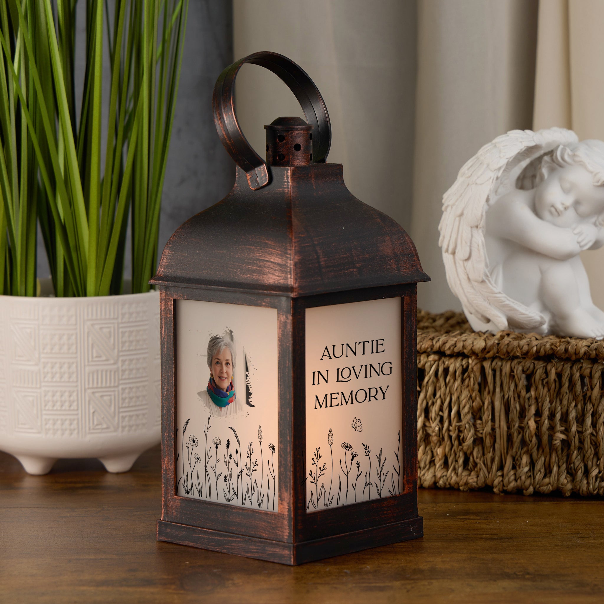 Personalised Memorial Photo Upload Lantern, Memorial Candle, Auntie Remembrance With Wildflowers