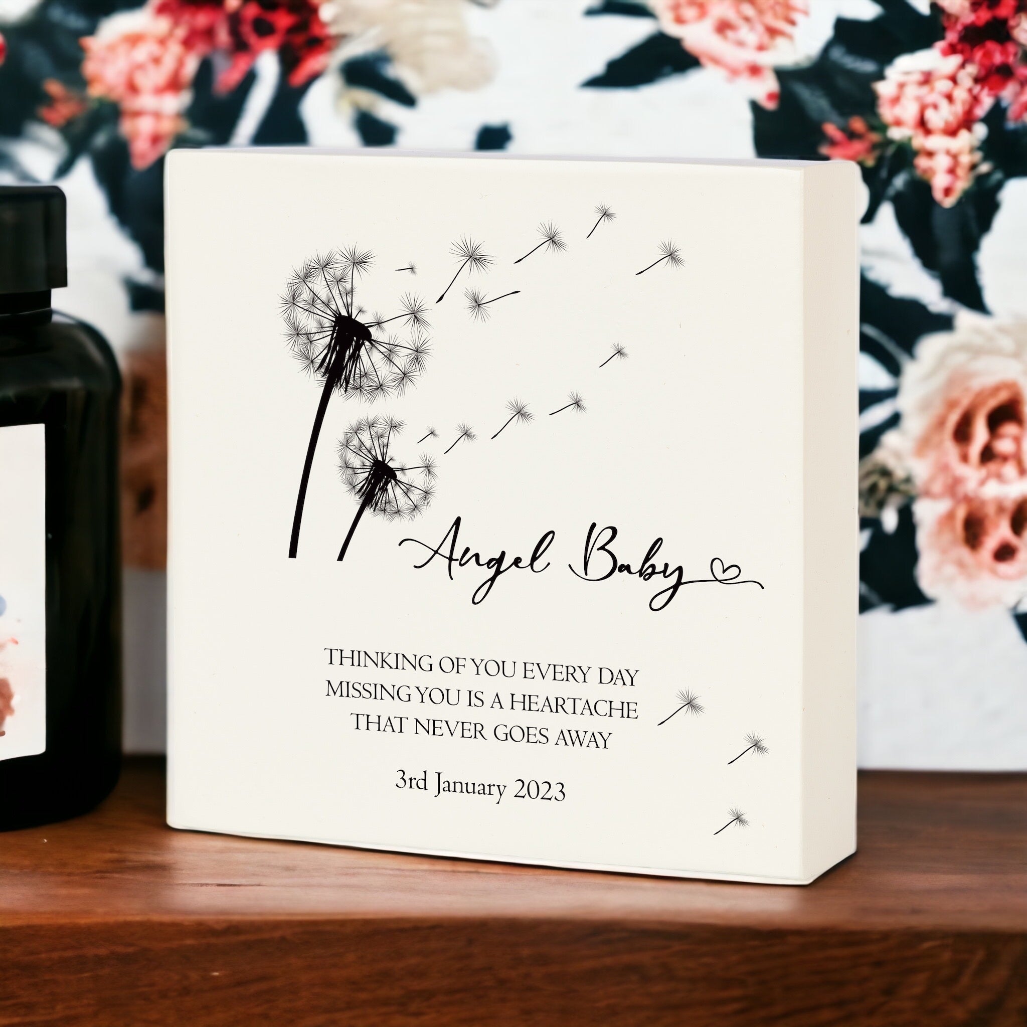 Honour and remember a lost loved one with this elegant angel baby graveside remembrance plaque. It features a dandelion design and is personalised with a date. Made from stone, the plaque is suitable for both indoor and outdoor use.