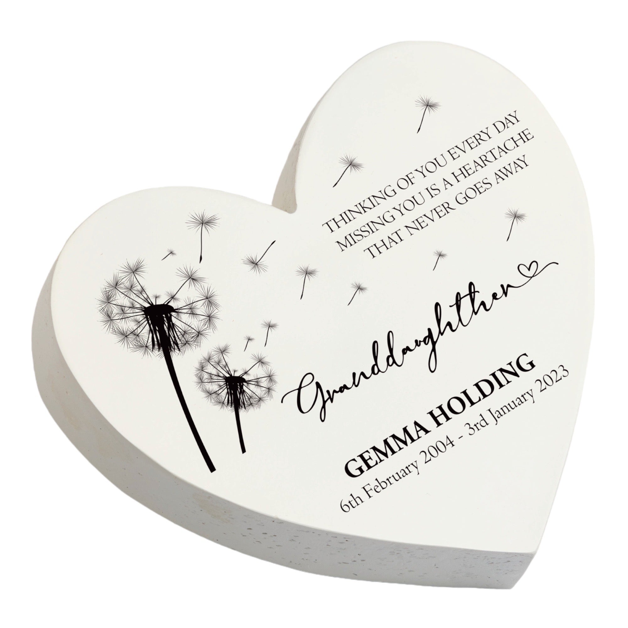 Honour and remember a lost loved one with this heart shaped Granddaughter graveside remembrance plaque. It features a dandelion design and is personalised with a name and date. Made from stone, the plaque is suitable for both indoor and outdoor use.