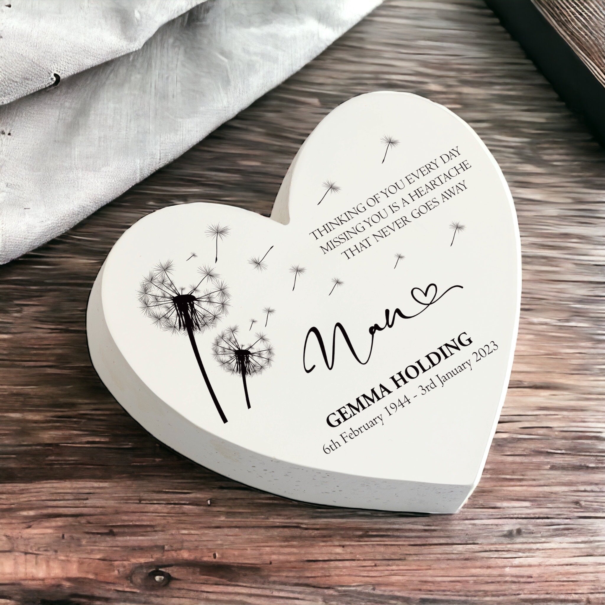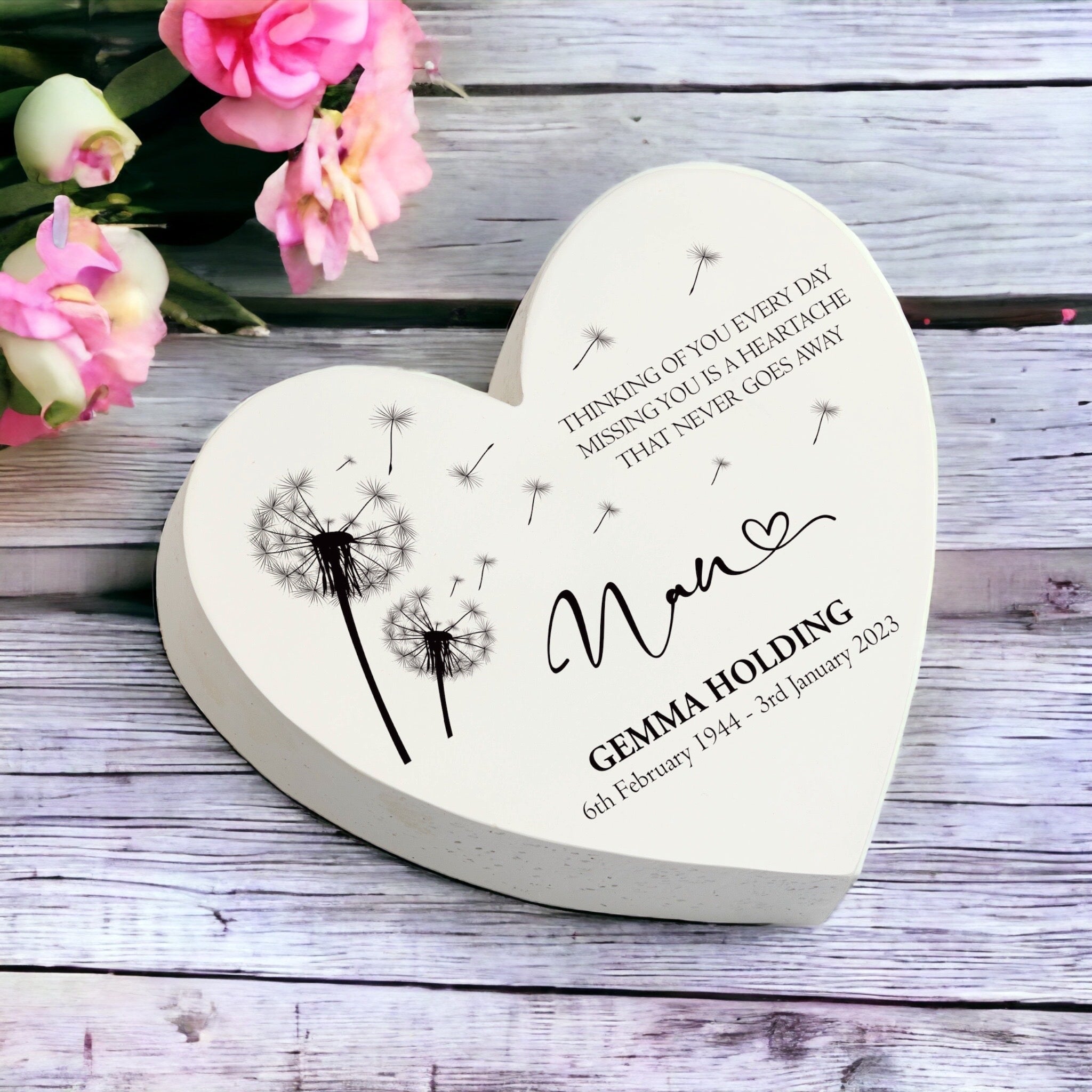 Honour and remember a lost loved one with this heart shaped Nan graveside remembrance plaque. It features a dandelion design and is personalised with a name and date. Made from stone, the plaque is suitable for both indoor and outdoor use.