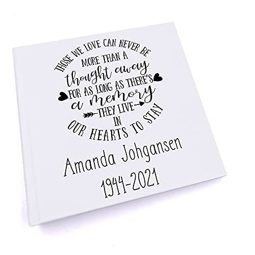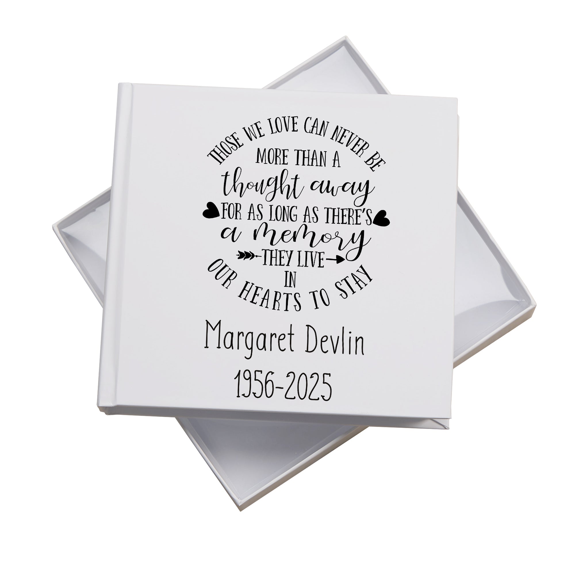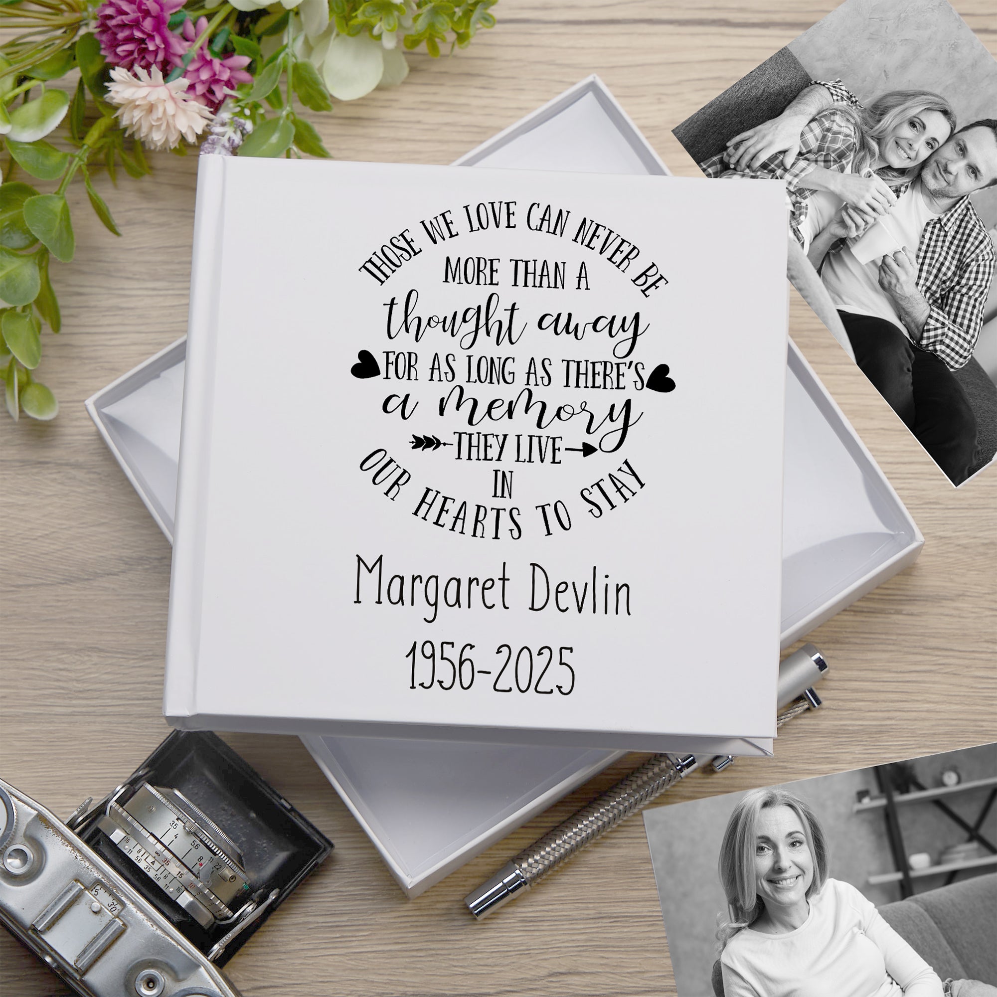 This customised album features a special cover sentiment that offers comfort and reflection during difficult times. It holds 50 slip-in 4" x 6" photos, each with adjoining space for personal notes or memories, allowing you to create a heartfelt tribute alongside each image. Measuring approximately 18.5cm by 19.5cm, the album provides a balanced size that is both spacious enough for your collection and compact enough for easy display. Beautifully presented in a tasteful box, it makes a meaningful keepsake or sympathy gift, offering a respectful and enduring way to preserve treasured moments and celebrate the lives of those who hold a special place in your heart.