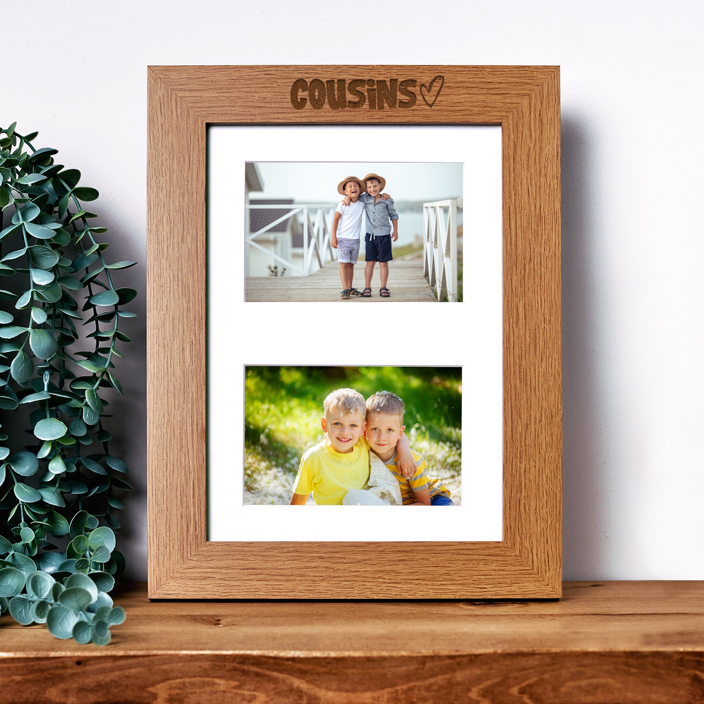 This 6x4 inch double wooden frame is perfect for displaying cherished memories. Perfectly finished with oak wood, it features an engraving of Cousins on top and a love heart. The frame has two 6" x 4" slots, and measures 41cm x 21cm. Perfect for table top or wall hanging.
