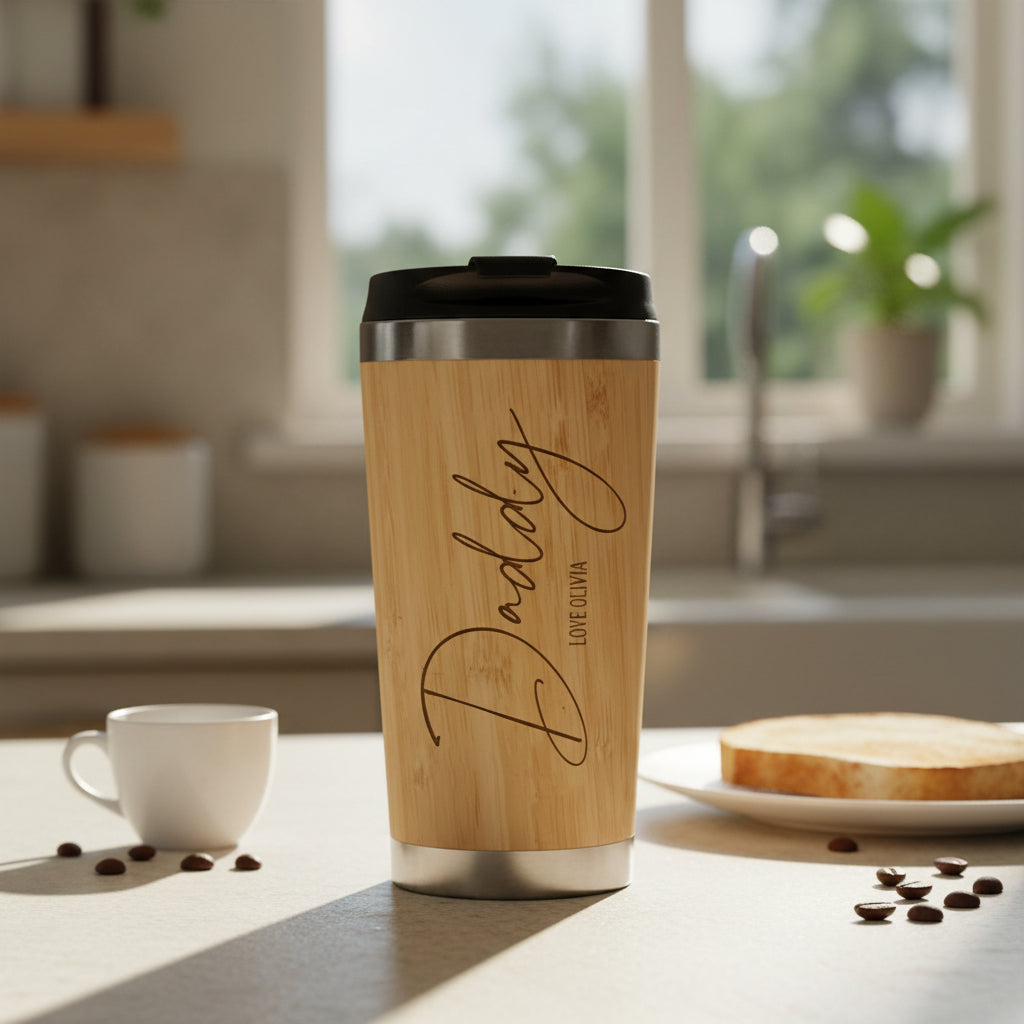 The Personalised Engraved Bamboo Insulated Daddy Travel Mug Gift combines eco-conscious design with practical functionality, making it an ideal choice for the environmentally aware parent. Crafted from sustainably farmed bamboo with a premium stainless steel double-wall interior, this mug maintains beverage temperatures for extended periods—keeping coffee piping hot during morning commutes or cold drinks refreshing throughout the day. With a generous 420ml capacity, it holds approximately 15% more liquid than standard mugs, reducing the need for frequent refills. The personalised engraving transforms this everyday essential into a meaningful keepsake, perfect for Father's Day, birthdays, or as a thoughtful corporate gift. Its durable construction withstands daily use whilst the natural bamboo exterior provides an elegant, contemporary aesthetic. Whether for the office, gym, or weekend adventures, this travel mug delivers sustainable style without compromising on performance or sentiment.