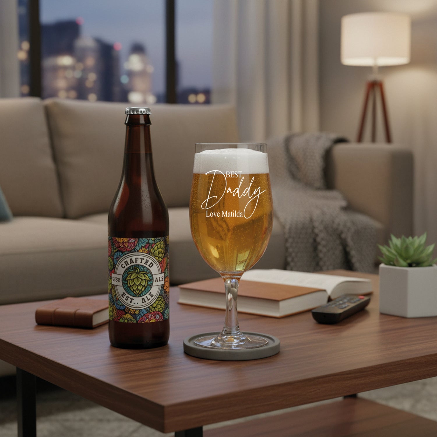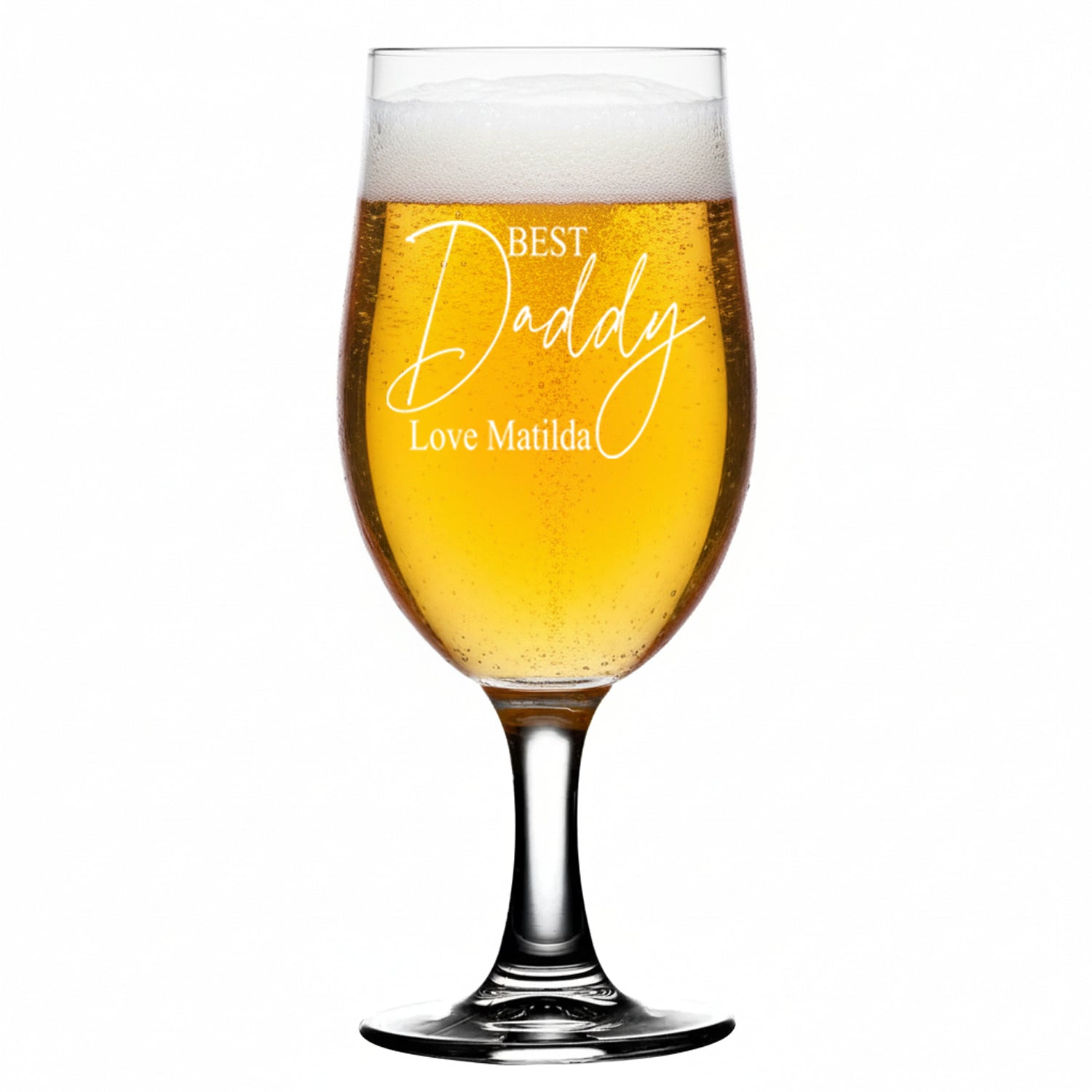 Personalised glassware can enhance the enjoyment of a beverage for any occasion. This special craft beer glass will be the pride and joy for a special Daddy to receive on any occasion, whether it be a birthday, father's day or at Christmas. Not only does the glass come personalised with Best Daddy and love from, it will also prove to be a valuable memory of that special occasion. These beer glass can be customised with any sentiment under Best Daddy ensuring the glass is a precious keepsake. The inscription makes this a highly personal and thoughtful gift for Daddy . This durable gift, which comes engraved is completely dishwasher safe and will last a lifetime. To make gift-giving as simple as possible, we package all of our personalised engraved glasses in gift boxes. The craft beer glass has a capacity of 50 cl, which is equivalent to a value of 16.75 oz. The bespoke beer glass has a height of 20.1 cm and an outer diameter of 9.45 cm. The weight of the glass is 298 grams. For the personalisation we just need the sentiment under Best Daddy, e.g. Love Alfie.