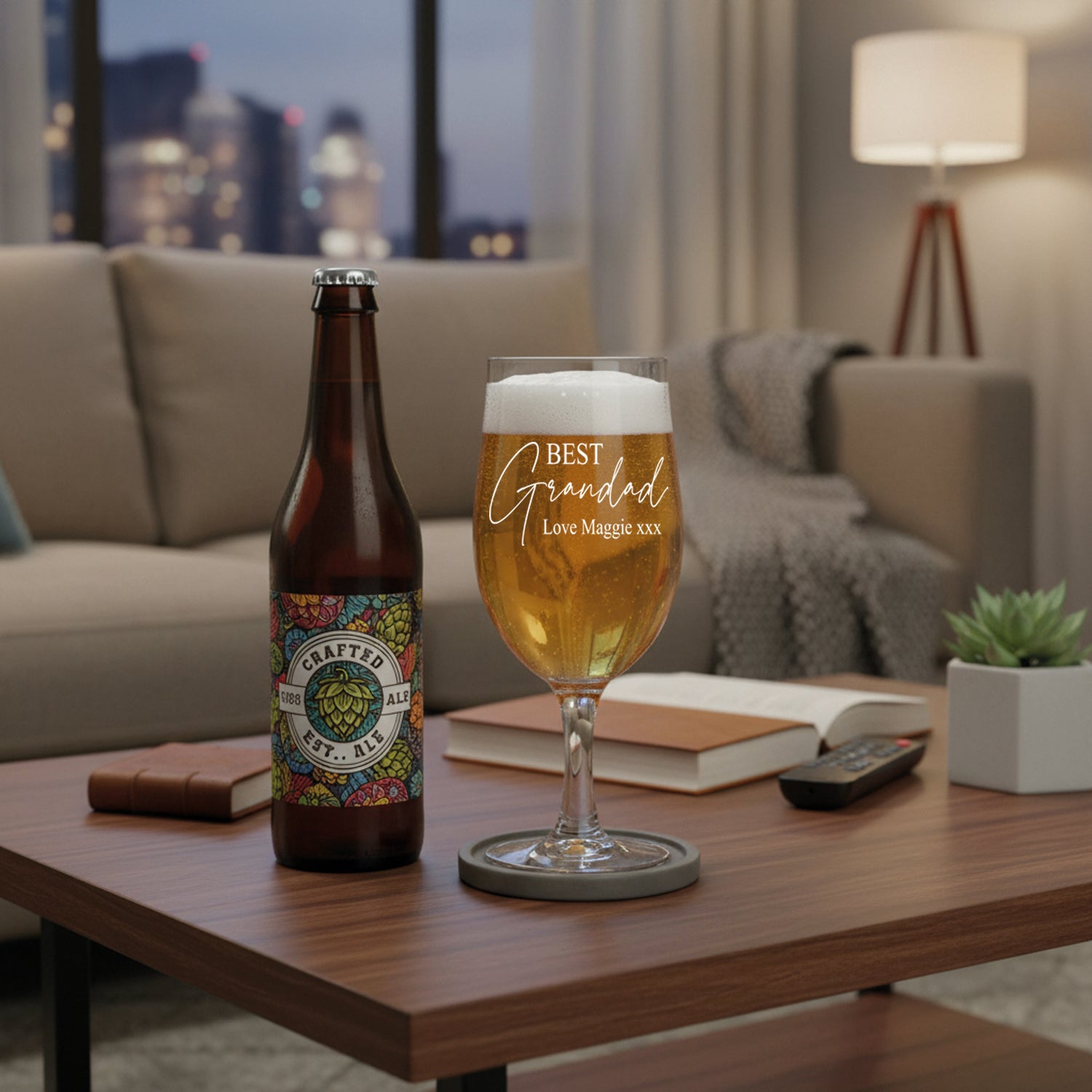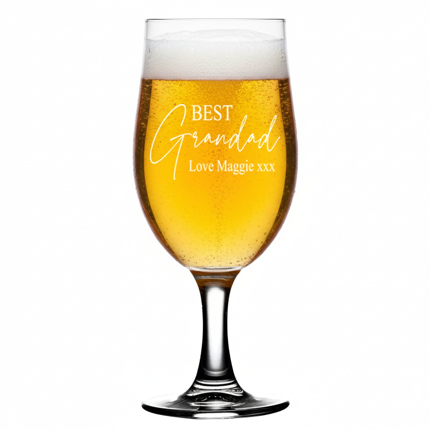 Personalised glassware can enhance the enjoyment of a beverage for any occasion. This special craft beer glass will be the pride and joy for a special grandad to receive on any occasion, whether it be a birthday, father's day or at Christmas. Not only does the glass come personalised with Best Grandad and love from, it will also prove to be a valuable memory of that special occasion. These beer glass can be customised with any sentiment under Best Grandad ensuring the glass is a precious keepsake. The inscription makes this a highly personal and thoughtful gift for Grandad. This durable gift, which comes engraved is completely dishwasher safe and will last a lifetime. To make gift-giving as simple as possible, we package all of our personalised engraved glasses in gift boxes. The craft beer glass has a capacity of 50 cl, which is equivalent to a value of 16.75 oz. The bespoke beer glass has a height of 20.1 cm and an outer diameter of 9.45 cm. The weight of the glass is 298 grams.