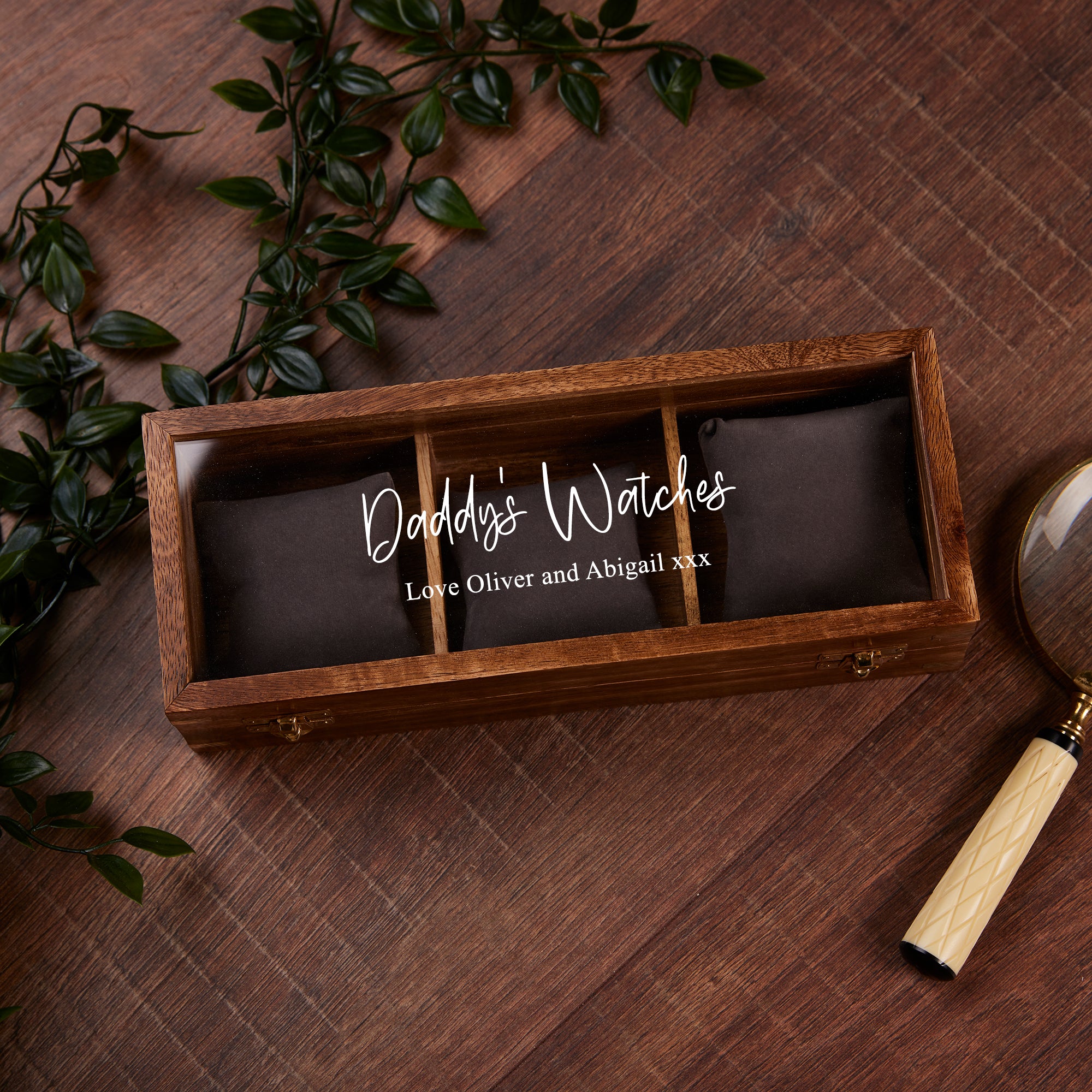 This Personalised 3 Watches Wood And Glass Watch Box is the perfect gift for any watch enthusiast. Handcrafted and made of premium quality materials, it is designed to showcase up to three of his favourite timepieces. The elegant design ensures that all his watches are stored in style.