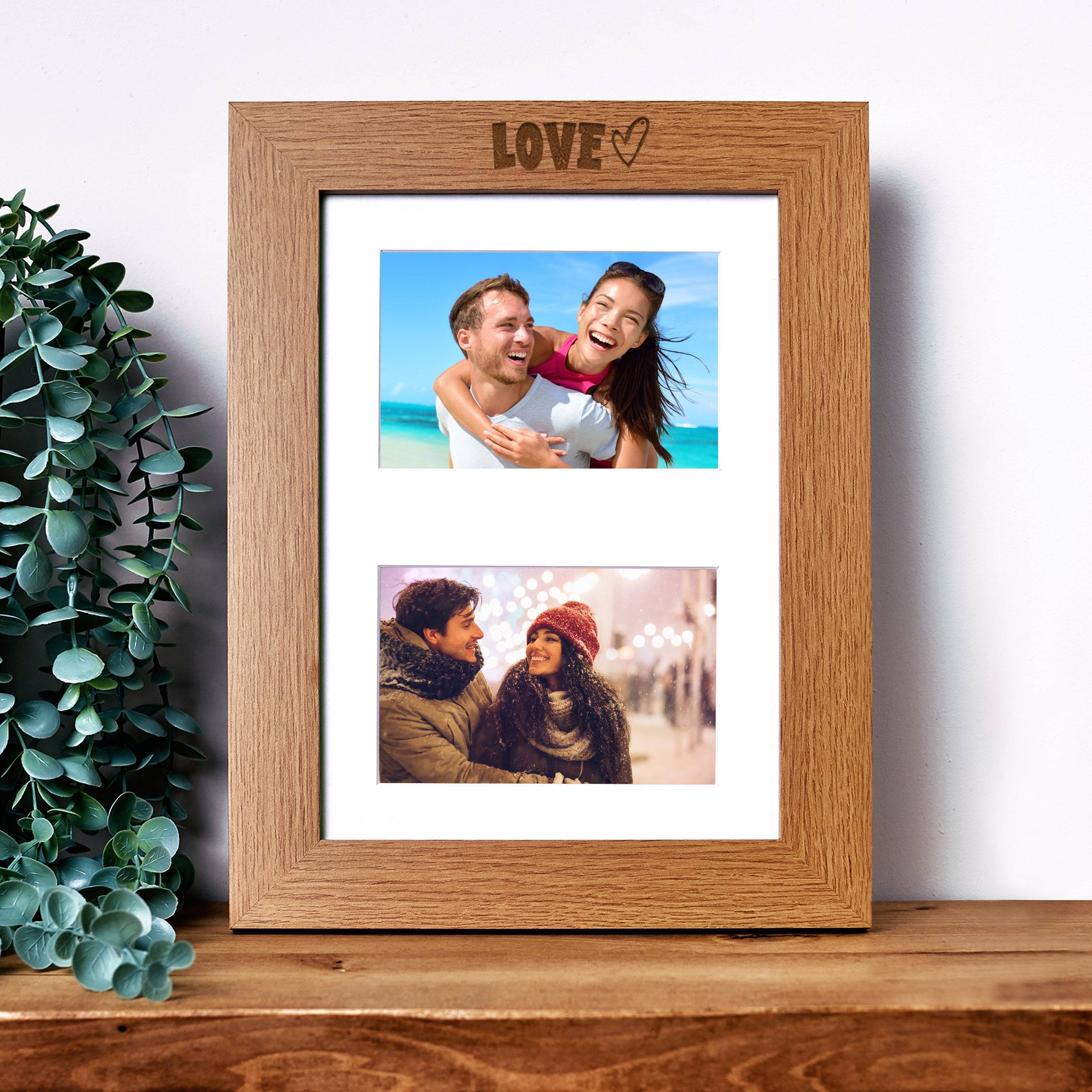 This 6x4 inch double wooden frame is perfect for displaying cherished memories. Perfectly finished with oak wood, it features an engraving of Love on top and a love heart. The frame has two 6" x 4" slots, and measures 41cm x 21cm. Perfect for table top or wall hanging.