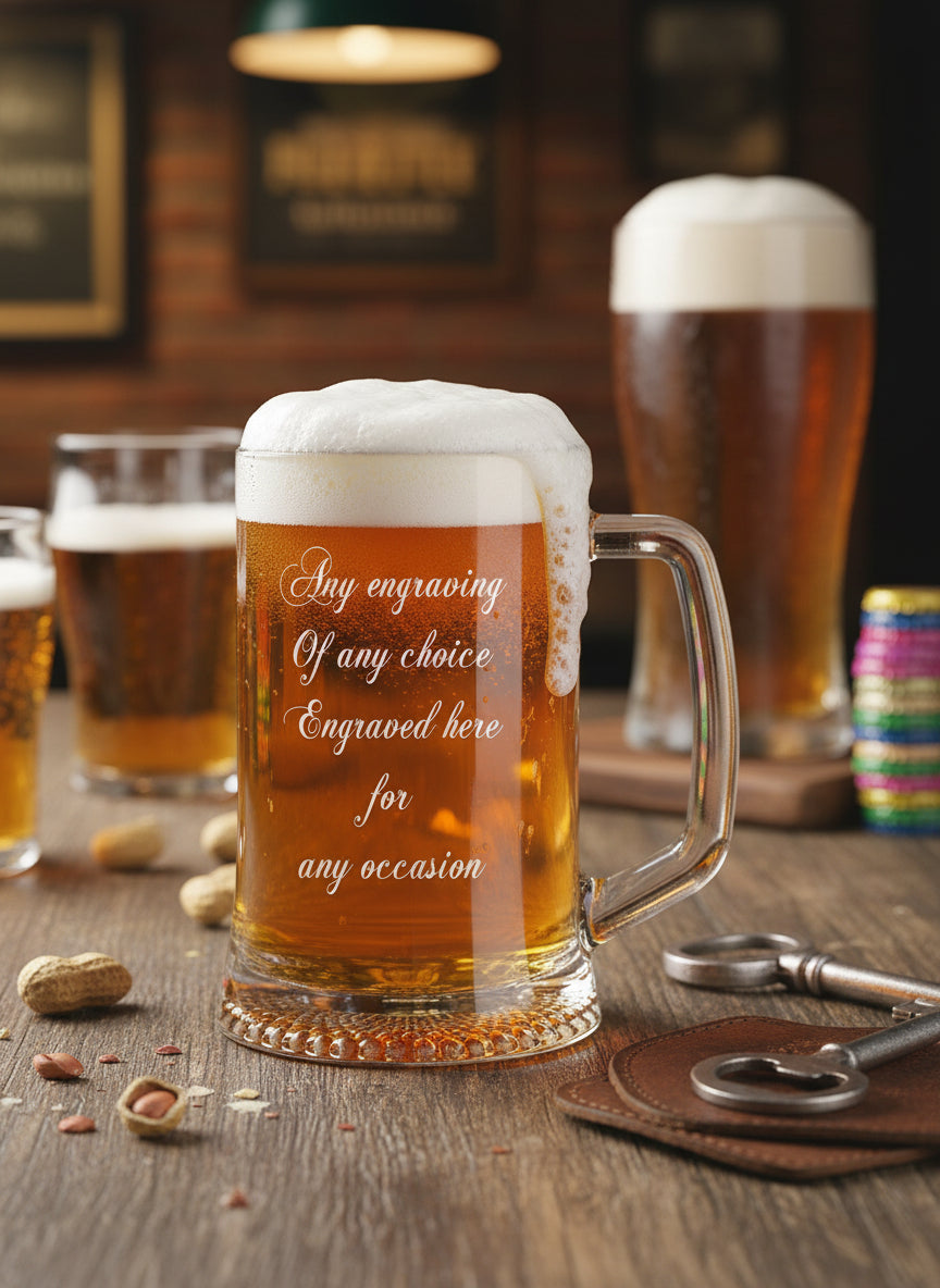 These bespoke tankards are suitable for use at any time of day and any occasion that requires alcoholic or non-alcoholic beverage. Whether marking a birthday, anniversary, promotion, retirement, wedding, or simply honouring someone special, this personalised pint glass is appropriate for virtually any celebration. The timeless design and customisable engraving make it versatile for multiple occasions and recipients.