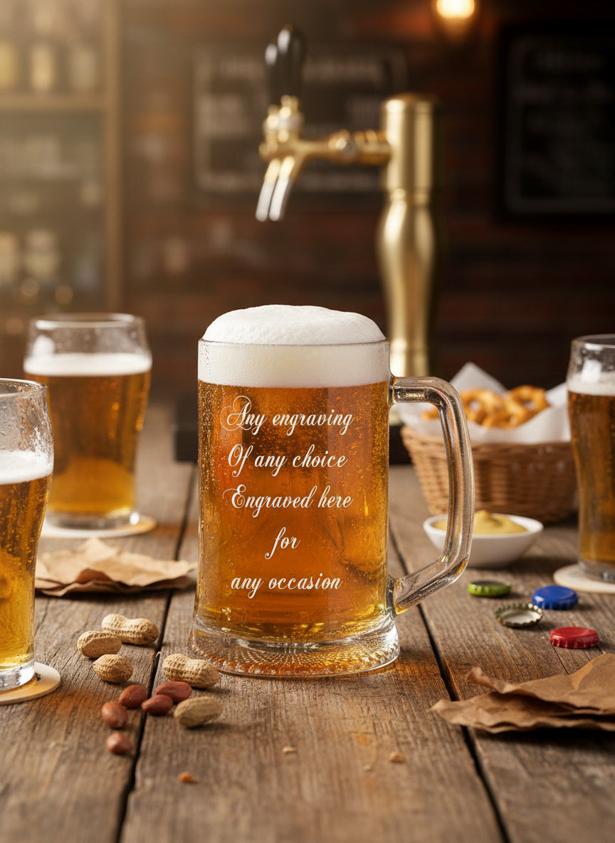 Celebrate the beer drinker in your life with this personalised beer tankard that transforms an everyday drinking vessel into a meaningful keepsake. This bespoke pint glass combines quality craftsmanship with custom calligraphy engraving, allowing you to express your gratitude and appreciation in a truly personal way.