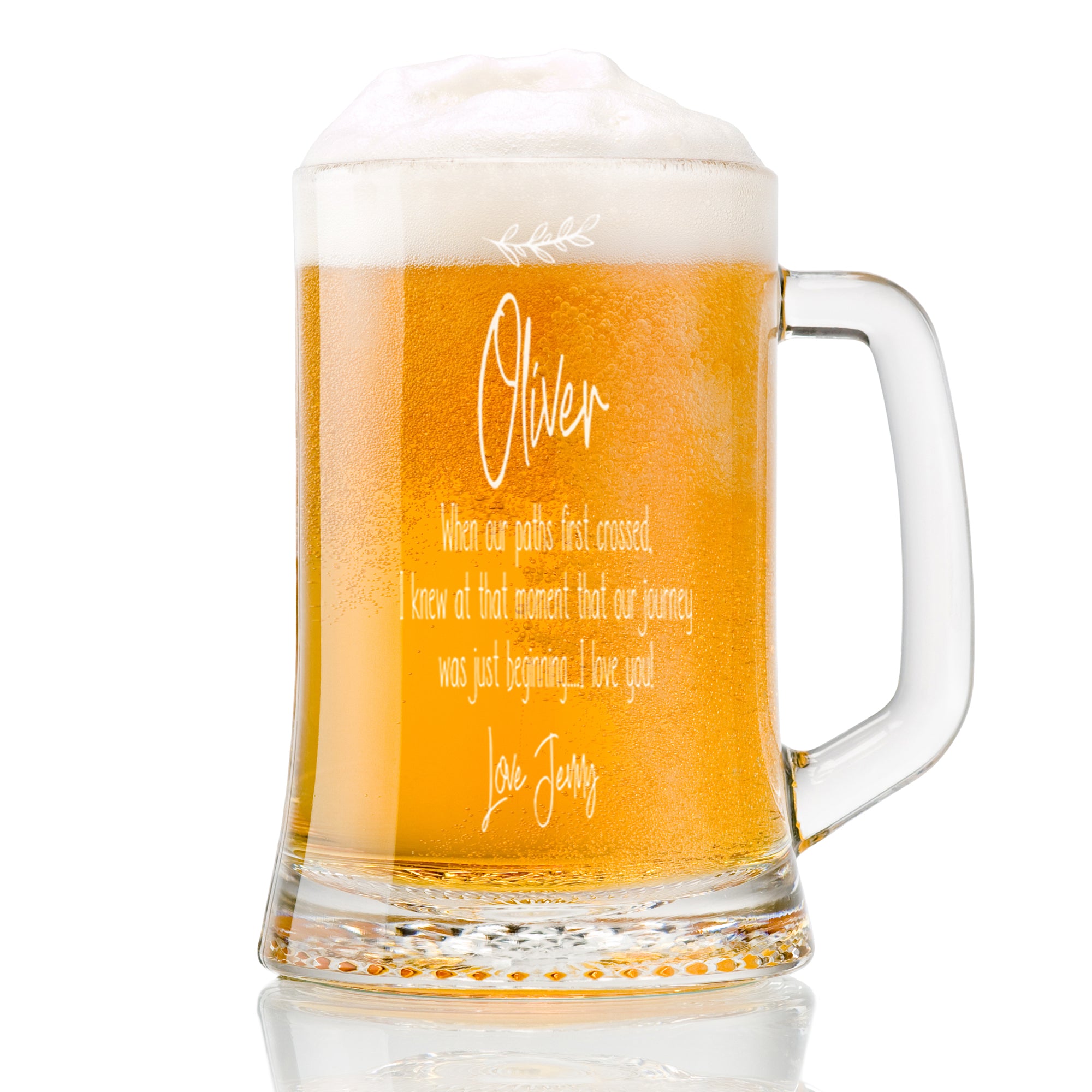 The beer glass tankard can have a personalised sentiment to make a spectacular and one-of-a-kind gift. Give your loved one a personalised beer tankard, and they'll cherish it always. This personalised glass holds 1 pint, or 568ml and comes in a gift box ready to give to the recipient.