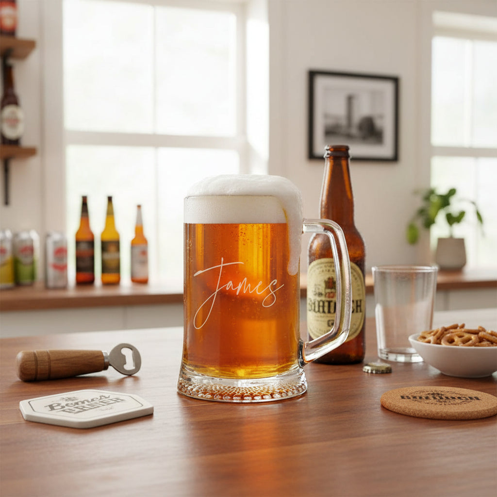 Finding the perfect gift for him requires something that celebrates his individuality whilst serving a practical purpose. This personalised beer tankard achieves that beautifully. Unlike generic gifts, the custom engraving with his name in elegant script font transforms a standard drinking glass into a deeply personal keepsake. Every time he enjoys his favourite beverage, he'll be reminded of your thoughtfulness and the special occasion you're celebrating.