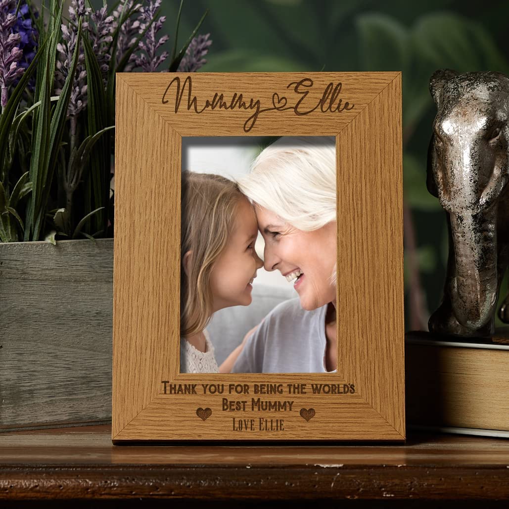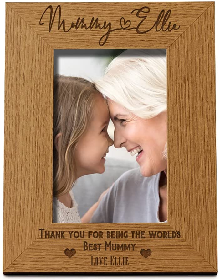 The frame has a oak wood finish and comes with "Mummy and a name" on the top...and thank you for being the world's best Mummy and the personalisation underneath. Please select the photo frame size you require, the sizes are for the photo size. There is a stand at the rear so will sit flat on any surface. For the personalisation we need the name at the top and the love bit at the bottom.