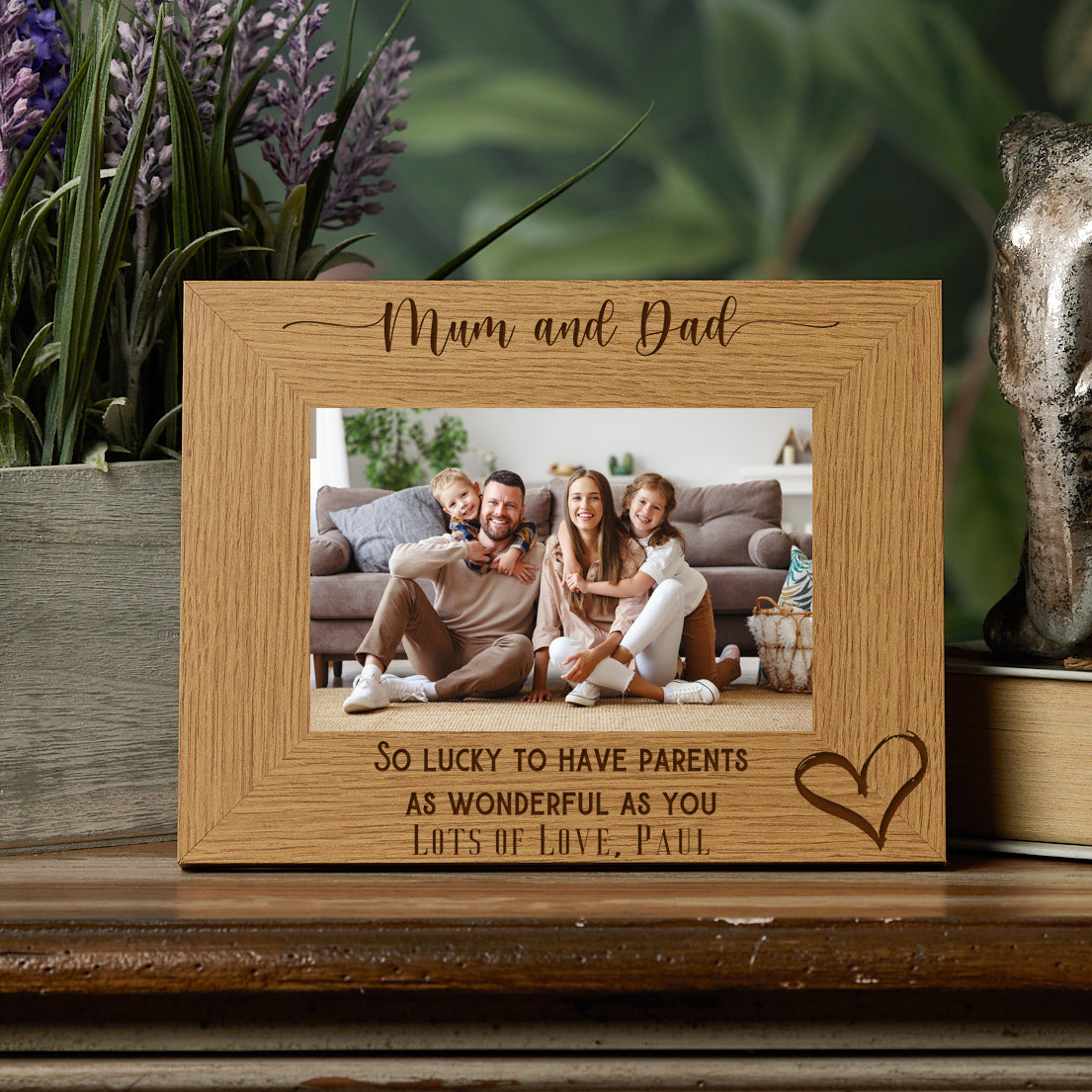 This personalised photo frame is crafted from solid wood, providing a timeless and sturdy finish that honours your parents beautifully. It features an elegant engraving with "Mum and Dad" at the top, paired with the touching sentiment "So lucky to have parents as wonderful as you," along with a customised message of your choice to make it truly unique. You can select the photo frame size according to the dimensions of the photo you wish to display. Designed for versatility, the frame can be hung on a wall or stood flat on any surface, making it an ideal keepsake to showcase cherished memories with your beloved parents.