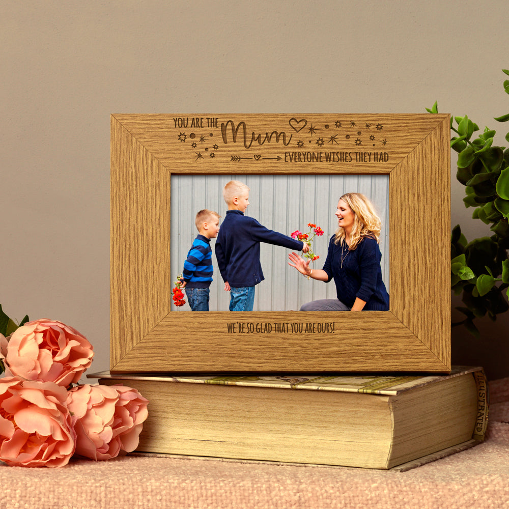 The frame has a oak wood finish with the engraving of "You are the Mum everyone wishes they had" on top with the love you to the moon logo while underneath you have the wording of "We're so glad you are ours" followed by your personalisation, e.g. Love from Lily Please select the photo frame size you require, the sizes are for the photo size.