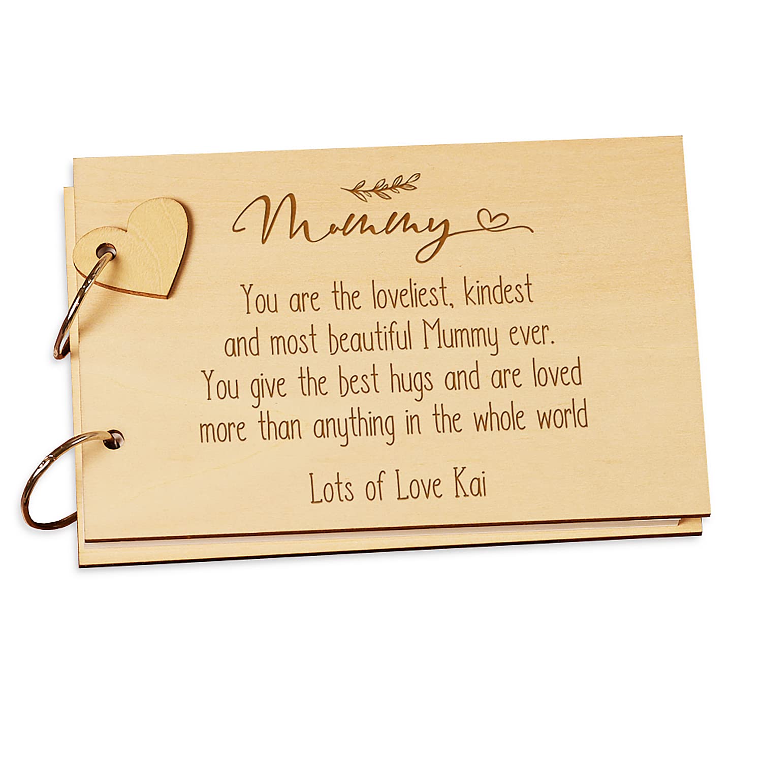 You can stamp in dates and make annotations to the pages easily, and even create fold-out pieces and pockets if you wish! Or simply have written memoirs from guests and relatives. The ring binding allows you to fill your pages as thickly as you like, so you can bring dimension to your designs. This scrapbook also uses high-quality paper that is strong and absorbent so that you can go wild with glues, paints, tapes and decorations! Preserve the good old days with a beautiful scrapbook that you can personalise, whether you?re intending to give it to a loved one or simply to build yourself. This is the perfect way to record your best memories! Size: 14.8 x 9.8 cm 30 Pages - More can easily be added. The personalisation is done into the wooden front cover.