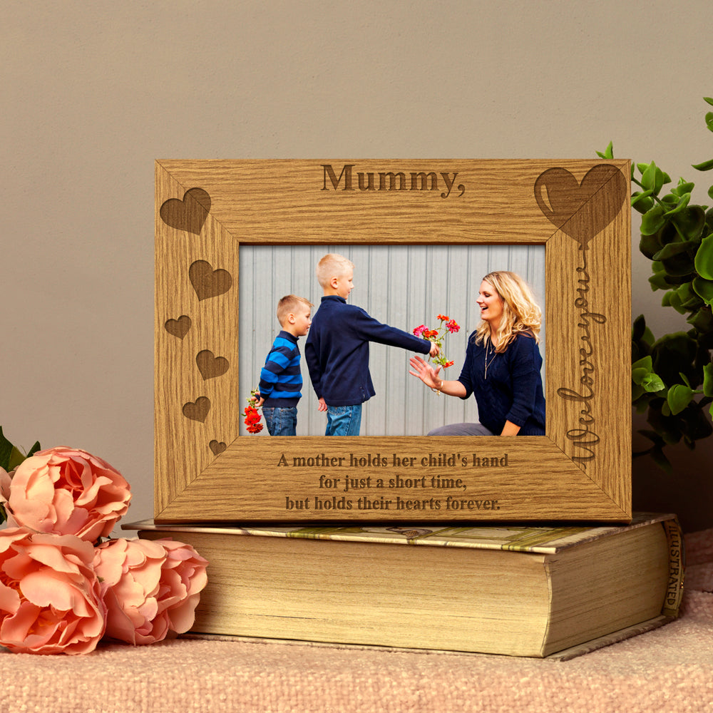 The frame has a oak wood finish with the engraving of "Mummy and the name of the kids" on top while underneath you have "A mother holds her child's hand for just a short time, but holds their hearts forever" Please select the photo frame size you require, the sizes are for the photo size. There is a stand at the rear so will sit flat on any surface