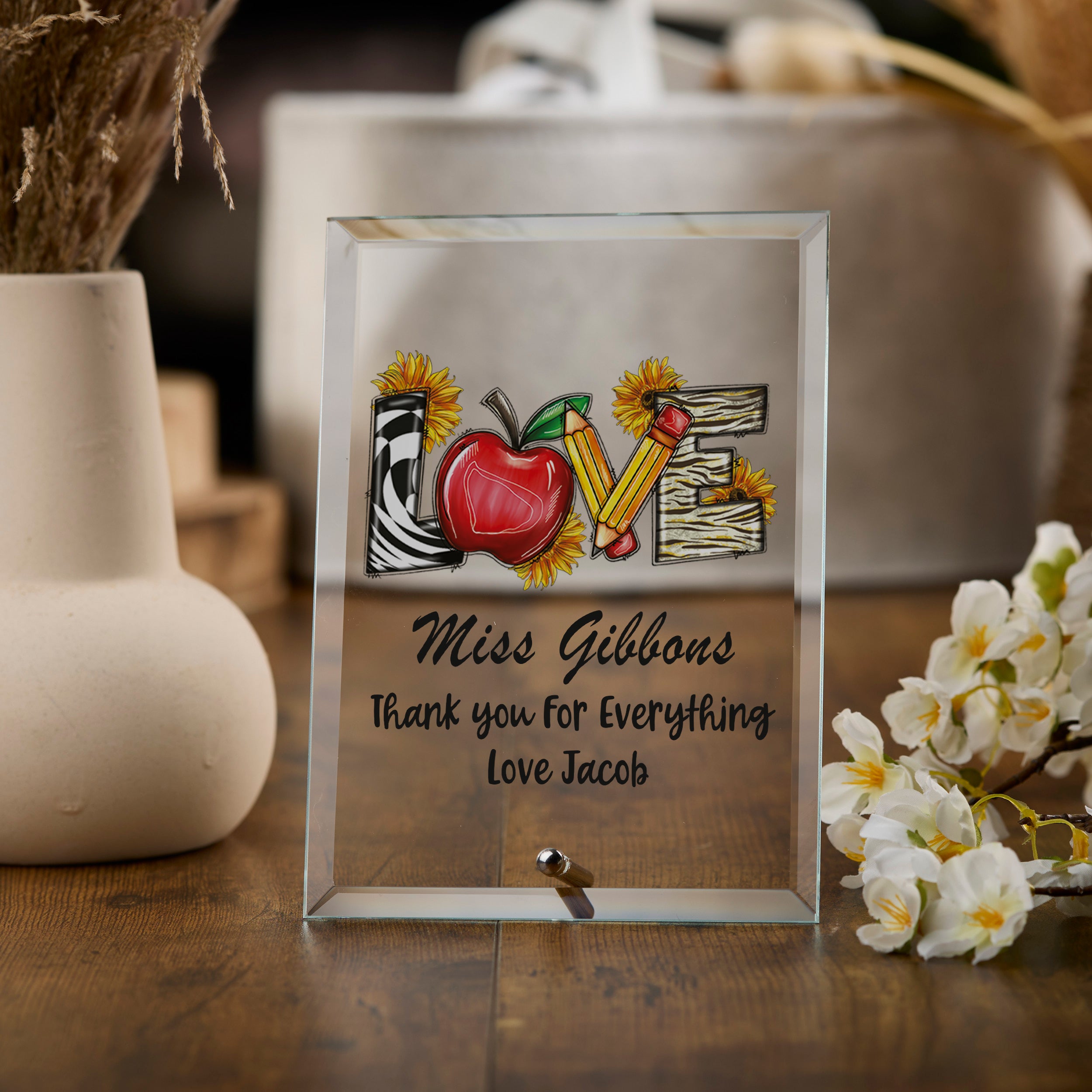 Personalised Teacher Love Plaque Gift With Apples and Pencils