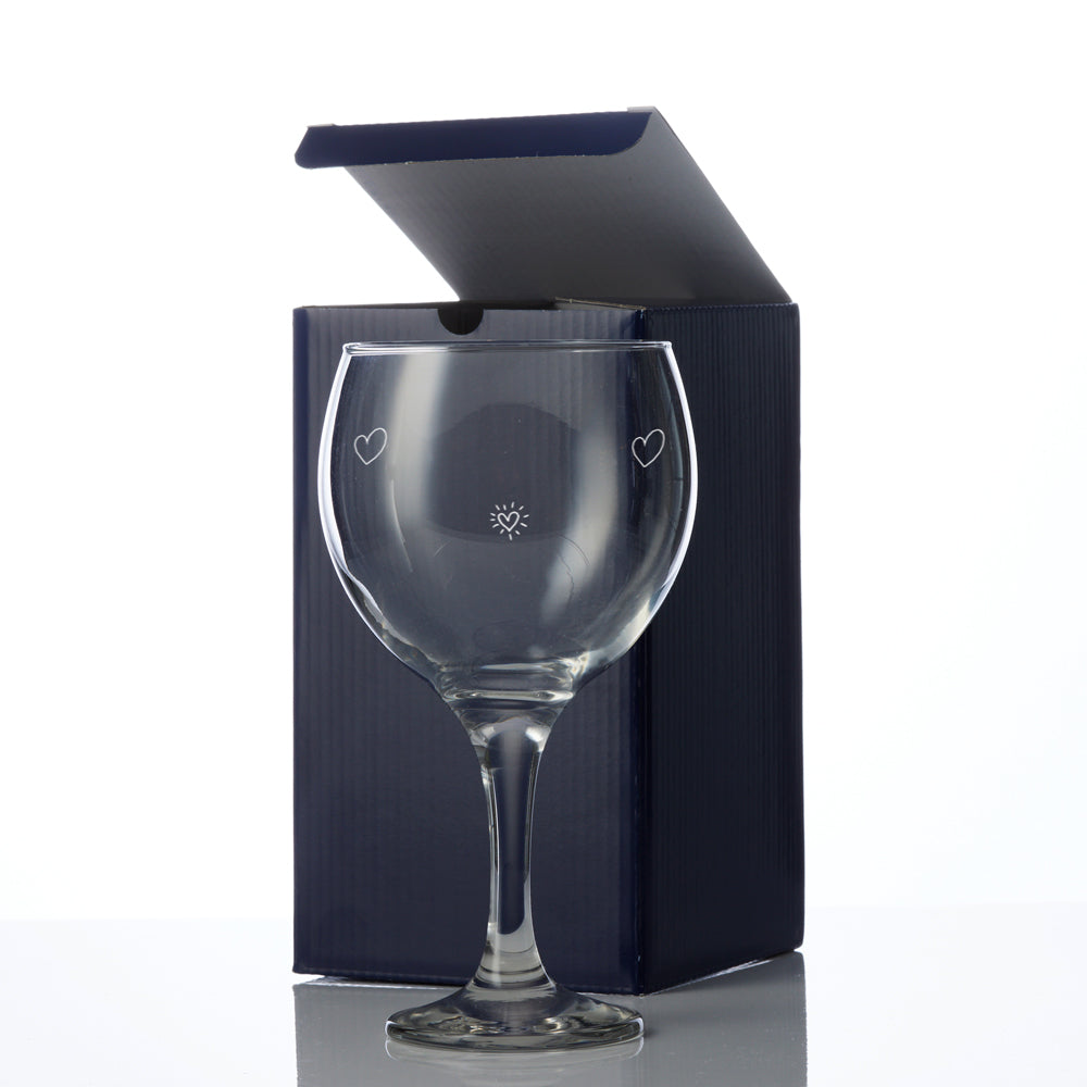 Our gin glasses are engraved with the latest laser engravers to make sure the inscription lasts a long time. Our gin glasses can carry 696ml of any drink because everybody loves a big glass. Make your loved one’s day extra special by gifting them this beautiful, personalised cocktail glass. It comes with a name of your choice on top with the two hearts, beneath you add the drink name e.g. Gin & Tonic,