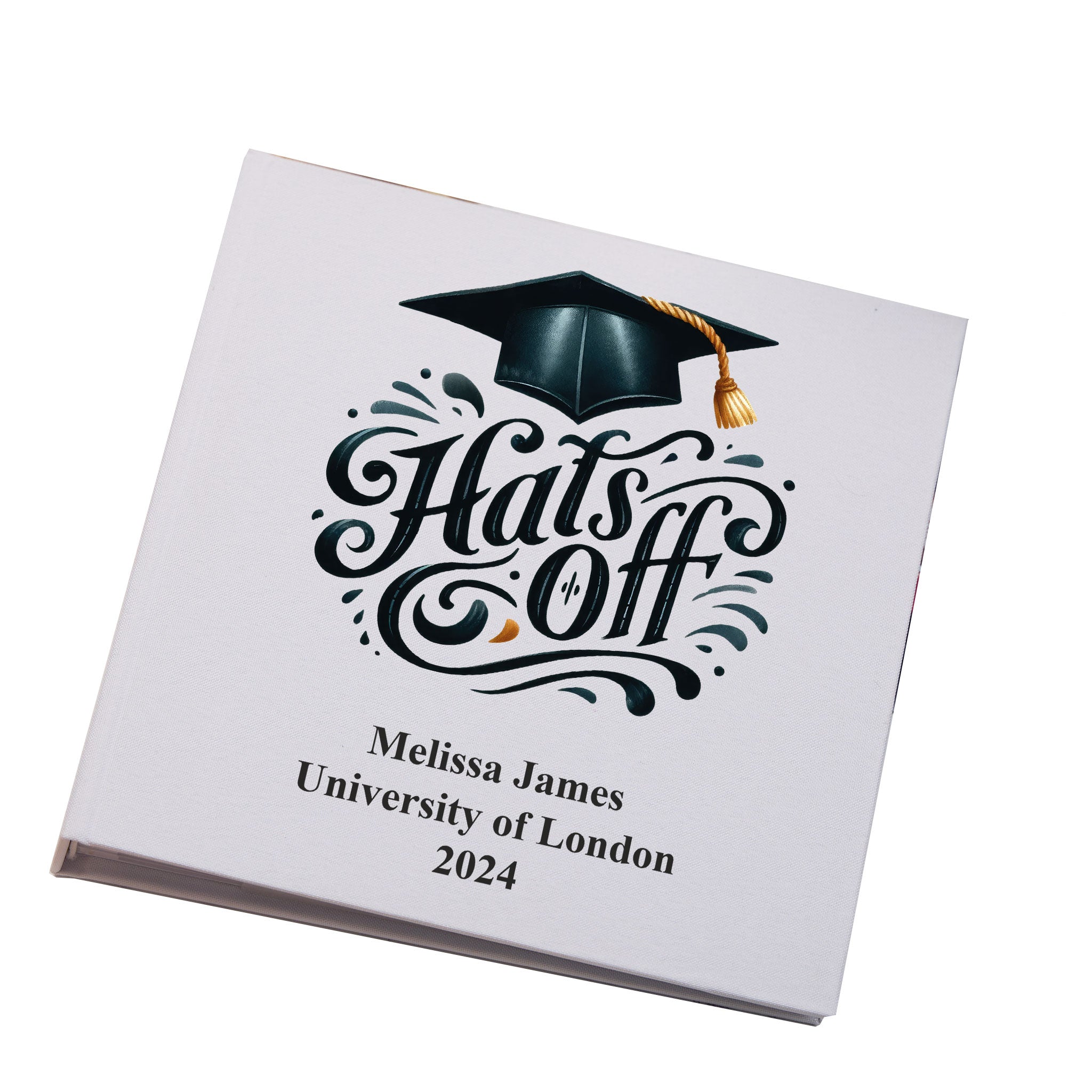 It's the perfect way to cherish your new beginning Capture the excitement of a special milestone with this personalised graduation photo album "Hats Off"! With its large book-bound design, you'll have ample space to treasure your favourite moments from this new chapter. This album serves as an ideal keepsake gift from a special occasion.