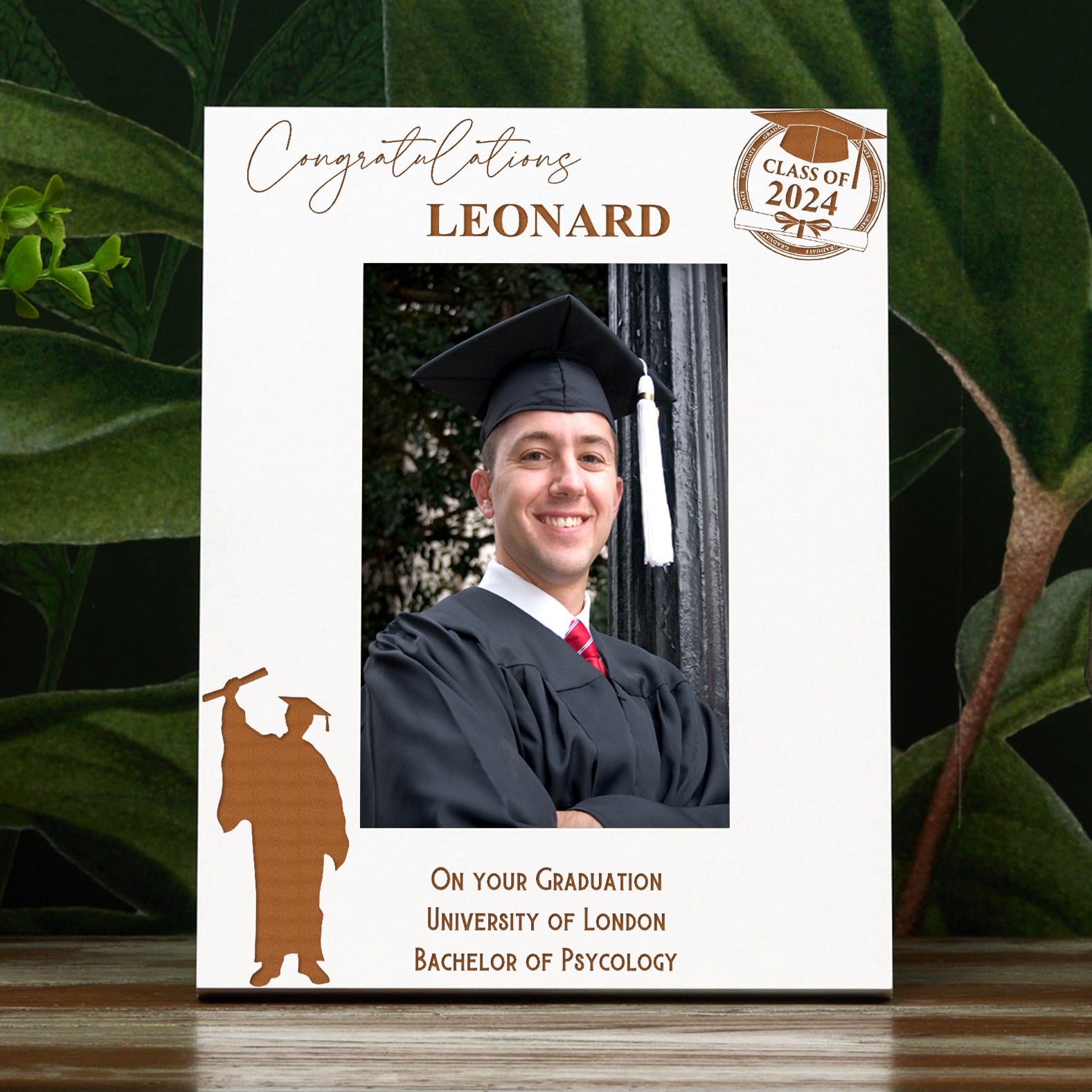 This personalised photo frame gift is the perfect way to commemorate a male's graduation. It offers a customised touch that makes it truly unique and special. On top you have the first name and graduation year while underneath there are the details of the university and course.