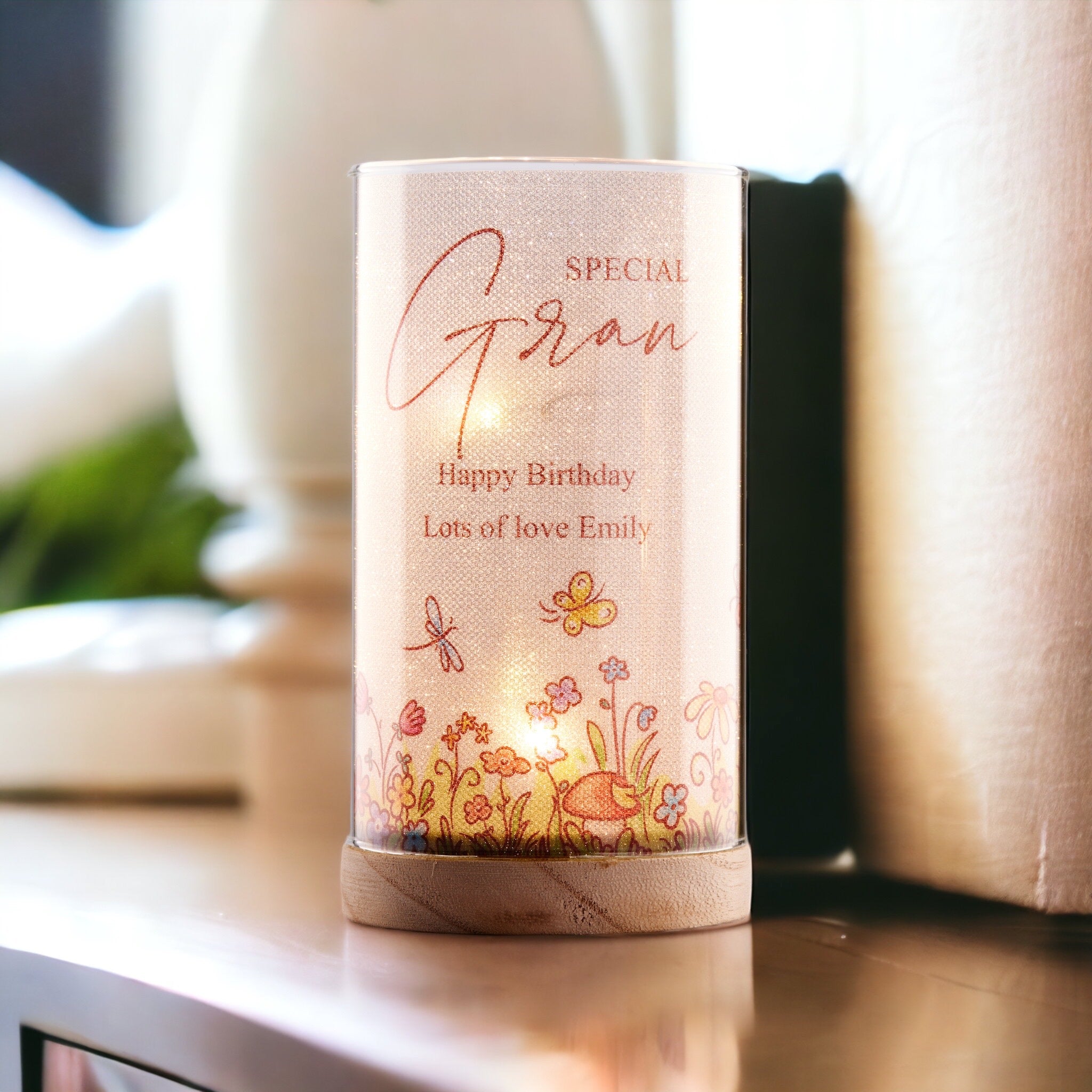 Personalised Gran Gift Floral Lamp With Wood Base LED Night Light