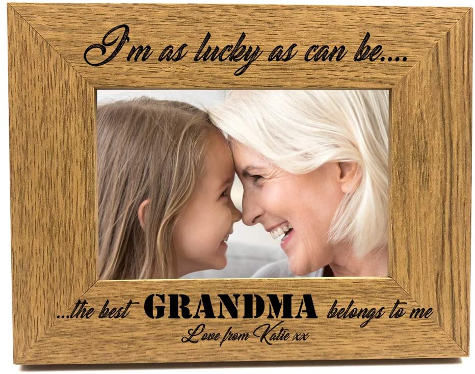 The frame has a solid wood finish with the engraving of "I'm as lucky as can be" and "The best grandma belongs to me" on the bottom part of the frame along with your wording. We personalise a name and date which can be added during checkout, though if missed please message us through you r completed order.