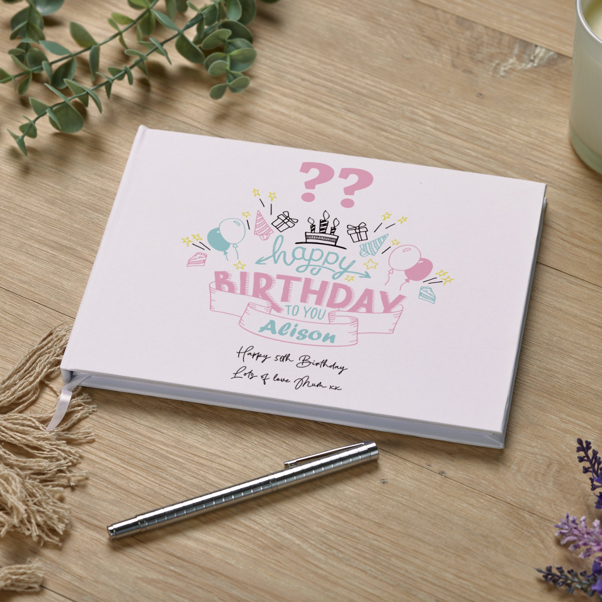 This can be used for lots of uses as well as wedding guest books. Inside the book has 80 lined pages. The book measures approx Size: 23cm x 17.5cm 80 Pages We personalise a name, age and Bottom Message required So for the personalisation we require a name, age and Bottom Message required ADD THIS IN THE 'MESSAGE TO SELLER' BOX DURING CHECKOUT