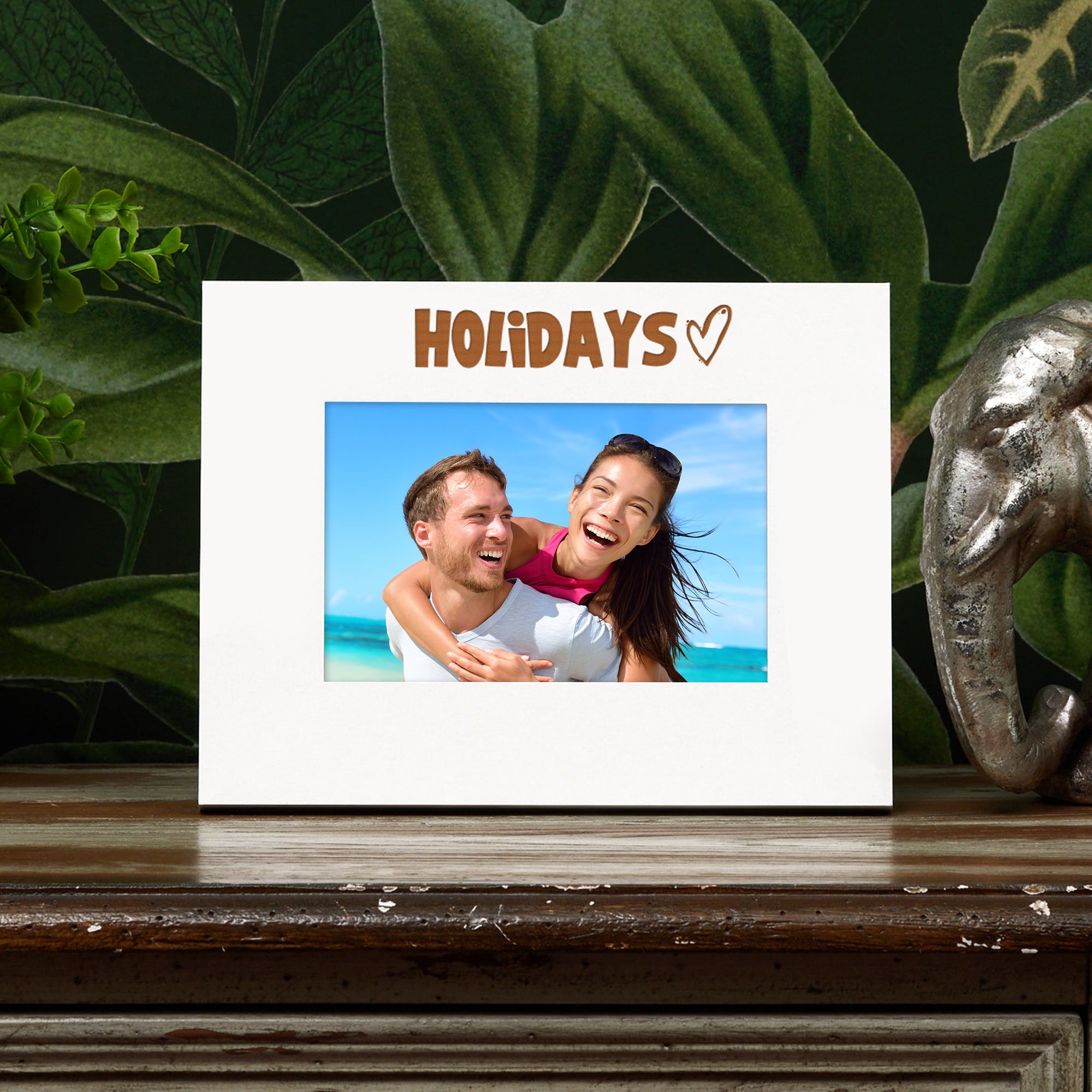 A lovely wooden frame to display that all important or memorable photo .The frame has a white wood finish with and comes with "Holidays" on top and a heart design to the side