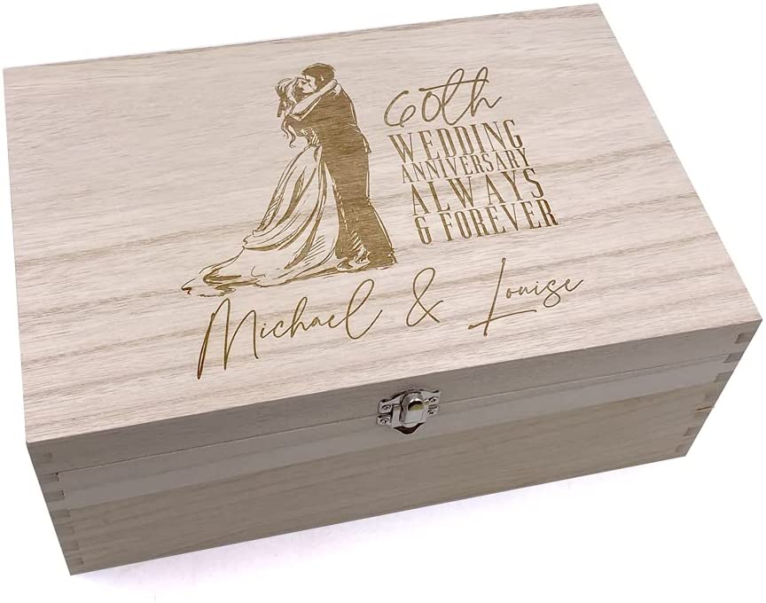 The box is hinged for easy opening and comes with a clip closure. Dimensions: 30 x 20 x 13 cm (11.8 x 7.9 x 5.1 inches) The personalisation is done with a laser engraver directly onto the wood giving it a lovely finish. All you have to do is add the names during checkout. Should you miss that then please message us through your order.