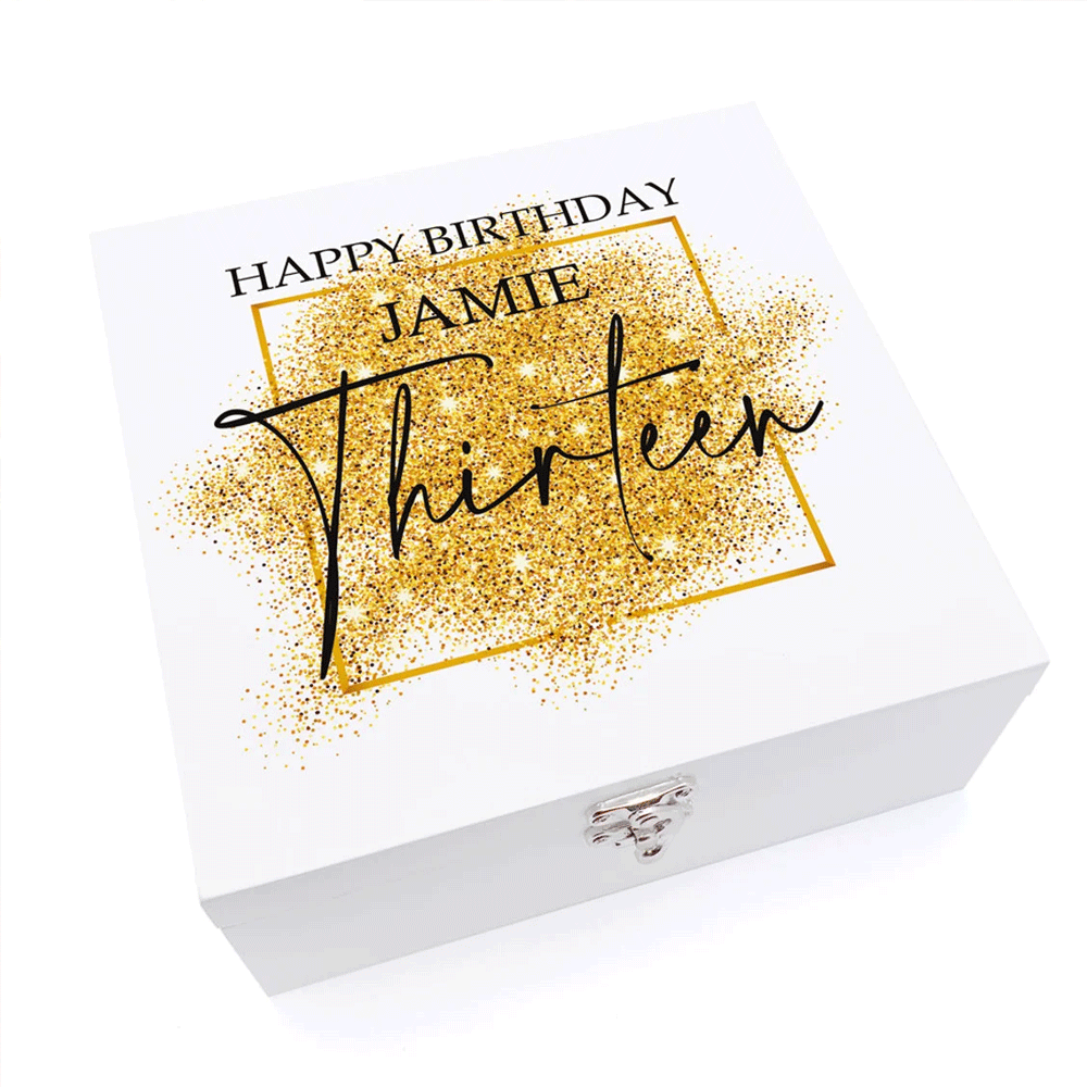 Personalised 13th Birthday Gift Keepsake Wooden Box With Gold Sparkles Design (Large)
