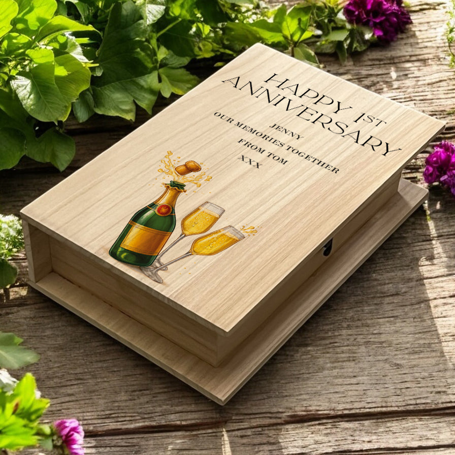 Mark your first anniversary with this personalised wooden keepsake box, expertly designed in the shape of a memory book. Crafted to hold photos, notes, and other treasured mementos, it provides a beautiful and lasting way to celebrate your special milestone. The elegant design and personalised touch make it a meaningful gift that preserves your most precious memories for years to come. Ideal for couples who value sentiment and craftsmanship, this keepsake box combines functionality with heartfelt significance.