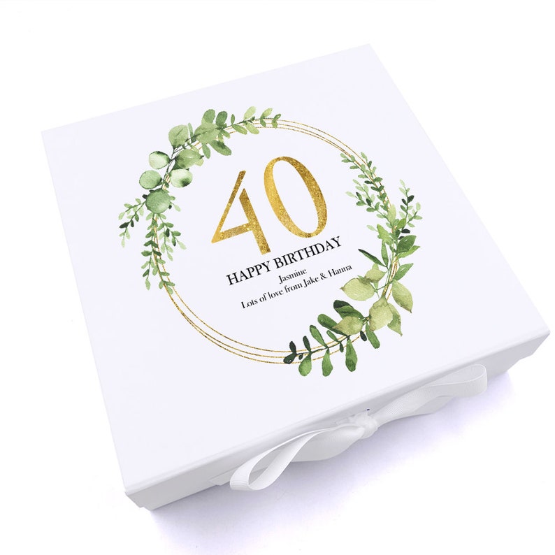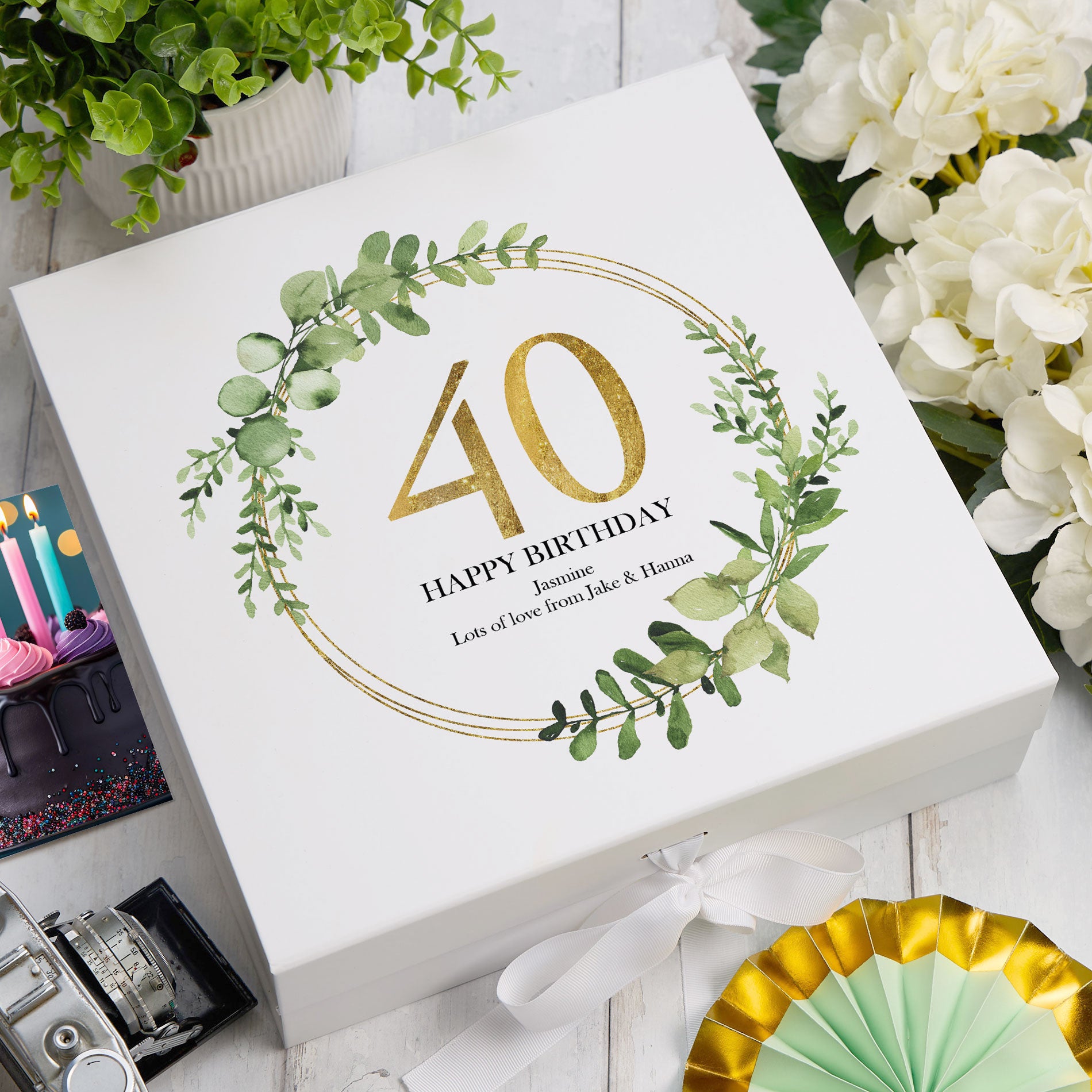 Celebrate a significant 40th birthday with this elegant Personalised Keepsake Memory Box for her, beautifully detailed with a gold wreath design. Designed to preserve precious moments, this box offers a stylish and thoughtful way to store photographs, cards, and other keepsakes from a memorable decade. The personalisation option adds a unique touch, transforming the memory box into a cherished gift that reflects her individuality. Combining timeless design with meaningful function, this keepsake memory box is the perfect way to honour her milestone and create lasting memories.