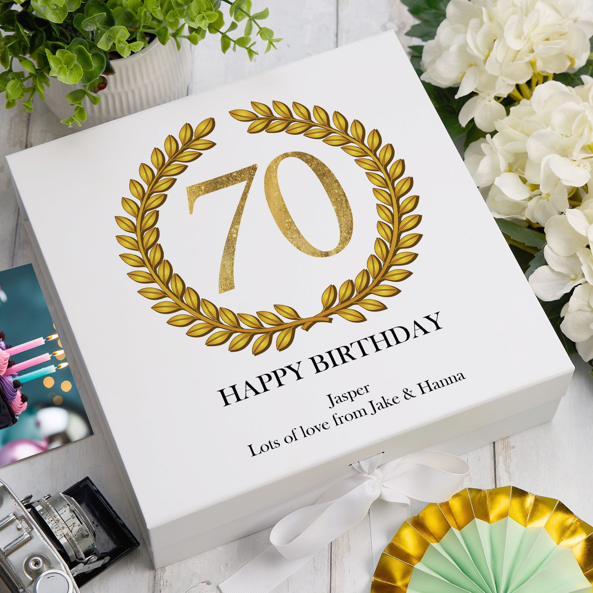 Celebrate a milestone with this personalised 70th birthday keepsake memory box designed specifically for him. Featuring an elegant gold wreath design, the box adds a classic and sophisticated touch to any cherished collection. Customisable with a name or special message, it creates a meaningful way to store treasured mementos from a lifetime of memories. Crafted with attention to detail and quality, this memory box offers both style and durability, making it a timeless gift that honours seven decades of life and achievement. Perfect for preserving precious moments and showing heartfelt appreciation on this special birthday.