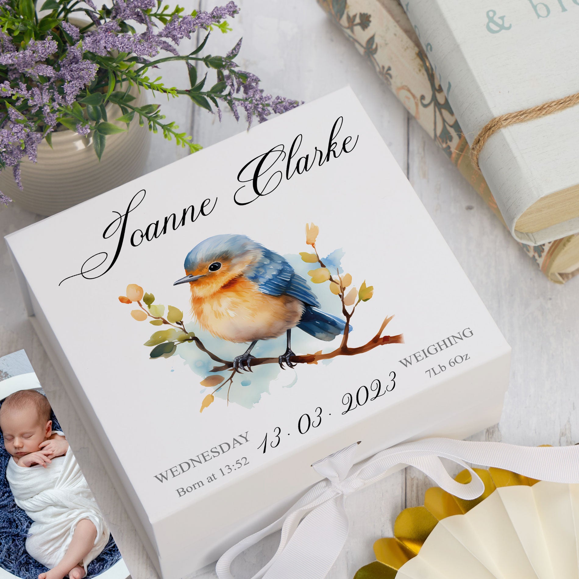 Personalised Baby Gift Box with Robin Keepsake Memories. Gorgeous luxury personalised printed rigid card gift box, with...