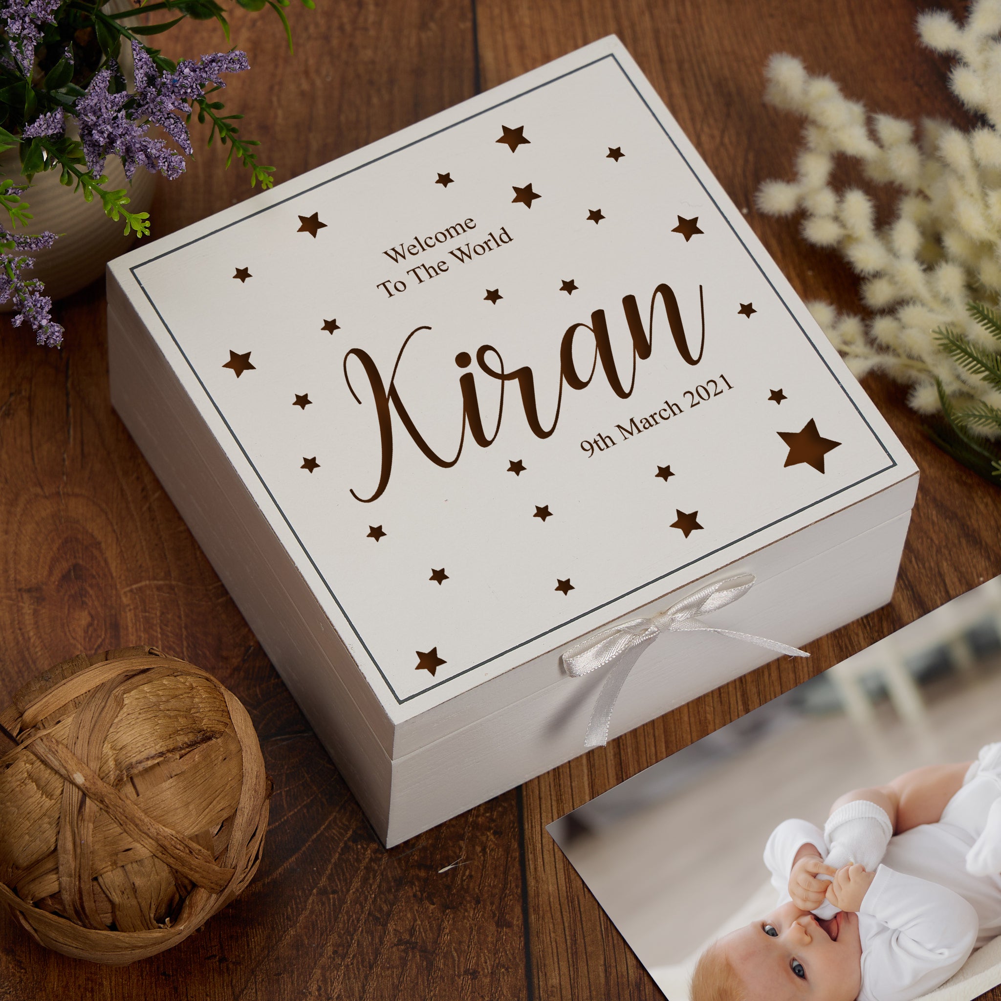It's an elegant and timeless keepsake box made from durable wood, designed to preserve precious memories for generations to come. Measuring H:7 W:16 D:16 cm and featuring a convenient hinged design, it also includes a charming ribbon detail for a touch of charm. With the option for personalization using high precision laser engraving technology, it makes for a thoughtful and special gift. Currently available in three versatile color options, this keepsake box is perfect for both baby boys and girls alike. Simply add your unique message at checkout to make it truly one-of-a-kind.