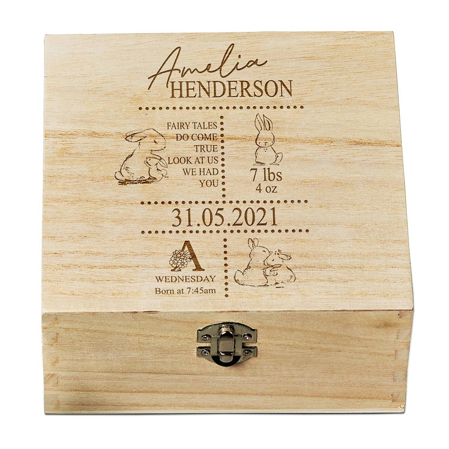 The box is hinged for easy opening and comes with a clip closure. Dimensions: 17 x 17 x 7 cm All you need to do is message us during checkout, though if missed then please send us a message through you completed order instead Please state: Name: Date: Weight: Day Of Birth: Time Of Birth: Initial to use: