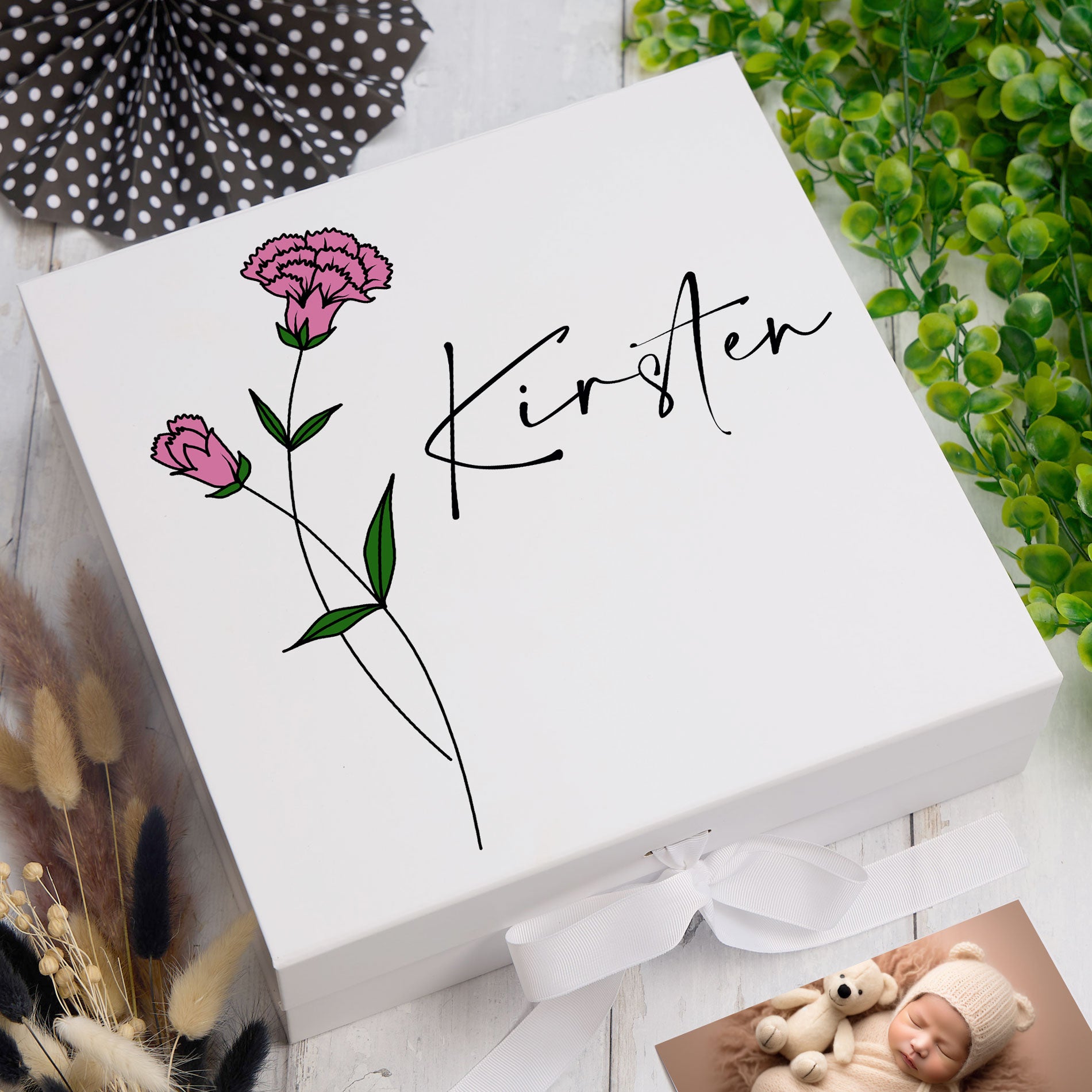 The personalised print on this luxury box is raised slightly to create a stunning embossed-style feature. The box itself is sturdy and durable - made from a luxurious 1200gsm white matt laminated rigid board. Available in two sizes and used as a gift box, as a memory box or as part of a hamper. Medium 17cm x 17cm x 8cm Large 30cm x 30cm x 9cm It can be used as a gift box, as a memory box or as part of a hamper. We personalise the flower and the name. (please refer to the image for the month and flower).