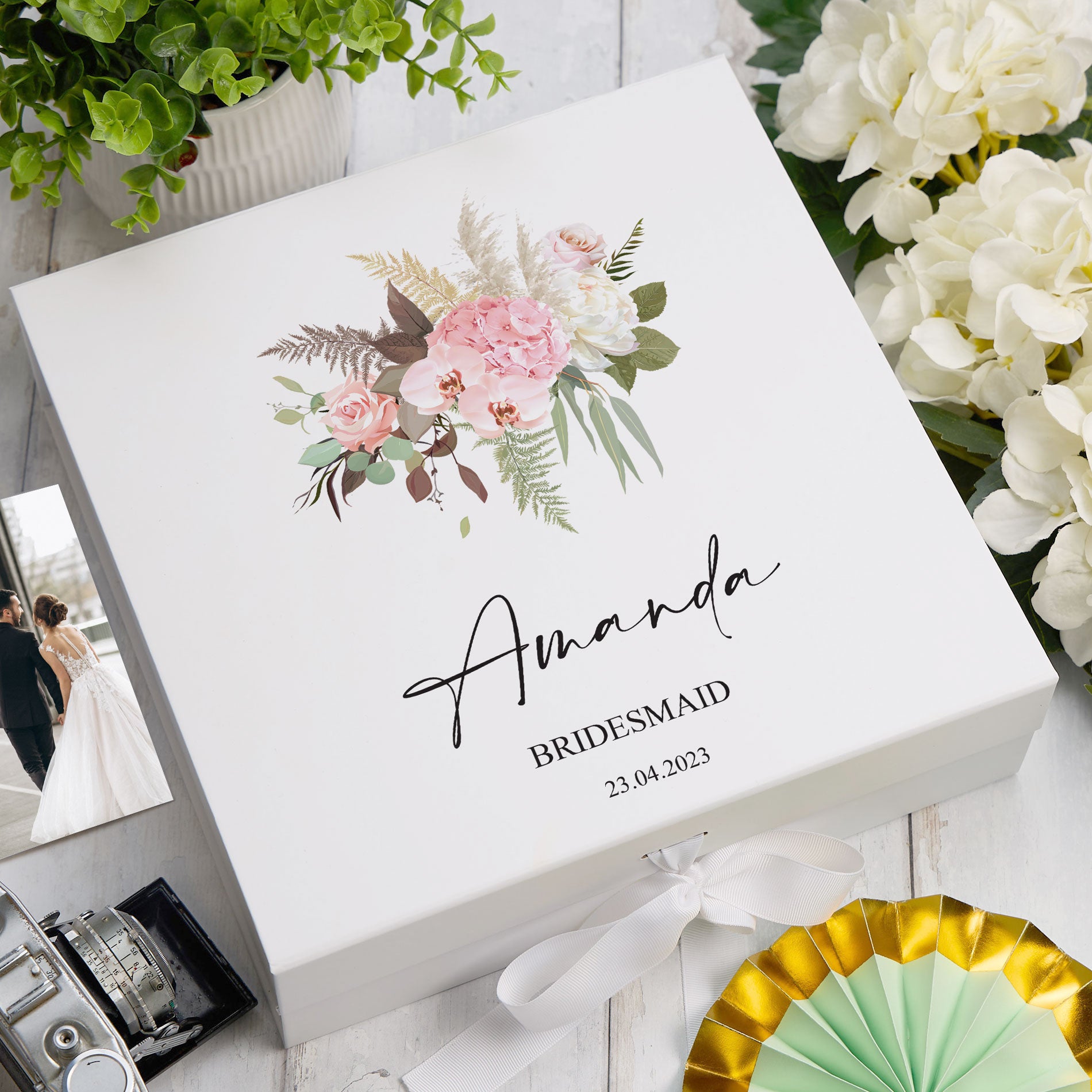 The personalised print on this luxury box is raised slightly to create a stunning embossed-style feature. The box itself is sturdy and durable - made from a luxurious 1200gsm white matt laminated rigid board. Available in two sizes and used as a gift box, as a memory box or as part of a hamper. Medium 17cm x 17cm x 8cm Large 30cm x 30cm x 9cm It can be used as a gift box, as a memory box or as part of a hamper.