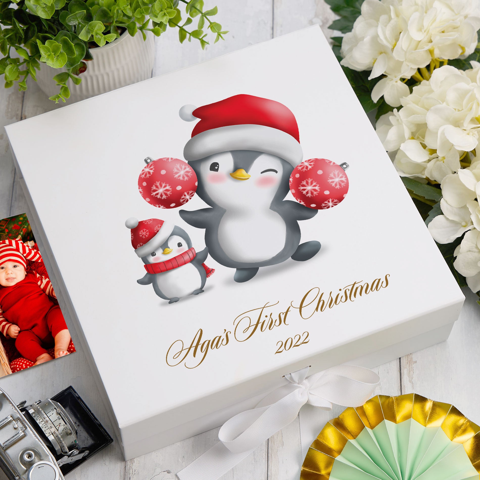 The personalised print on this luxury box is raised slightly to create a stunning embossed-style feature. The box itself is sturdy and durable - made from a luxurious 1200gsm white matt laminated rigid board. Available in two sizes and used as a gift box, as a memory box or as part of a hamper. Medium 17cm x 17cm x 8cm Large 30cm x 30cm x 9cm It can be used as a gift box, as a memory box or as part of a hamper.