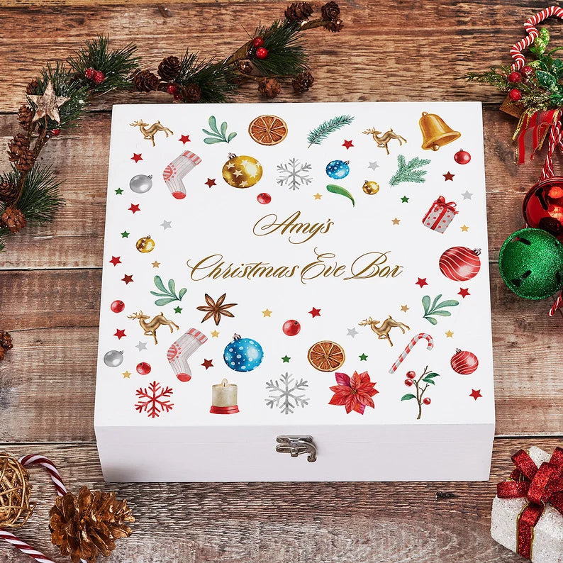 Personalised Christmas Eve Wooden Box With a Decorative Design
