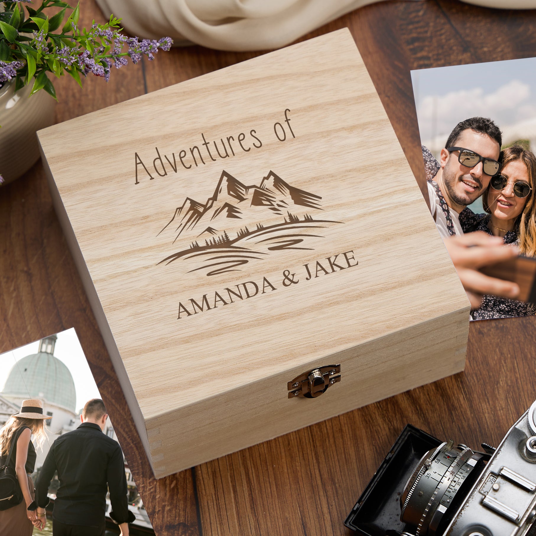 The Personalised adventures Keepsake Box Gift is the perfect way to treasure and remember one's special travels. Made with a beautiful sentiment, this keepsake box is a timeless and elegant piece that will display your cherished memories for years to come. With its personalised touch, it's a unique and thoughtful gift for any traveller. Preserve your memories in style with this stunning keepsake box.