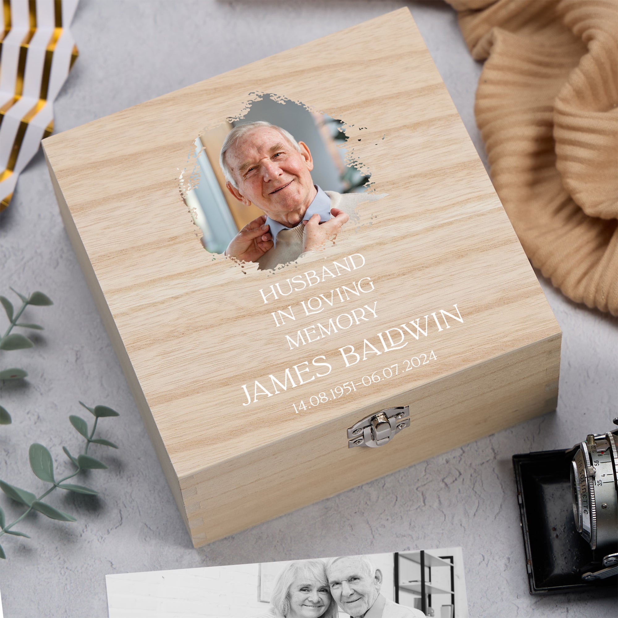 Capture your happiest memories and honour your beloved person forever. With our personalized Husband In Loving Memory Wooden Keepsake Box, you can showcase their name and treasured photos, creating a timeless keepsake that will be cherished for years to come.