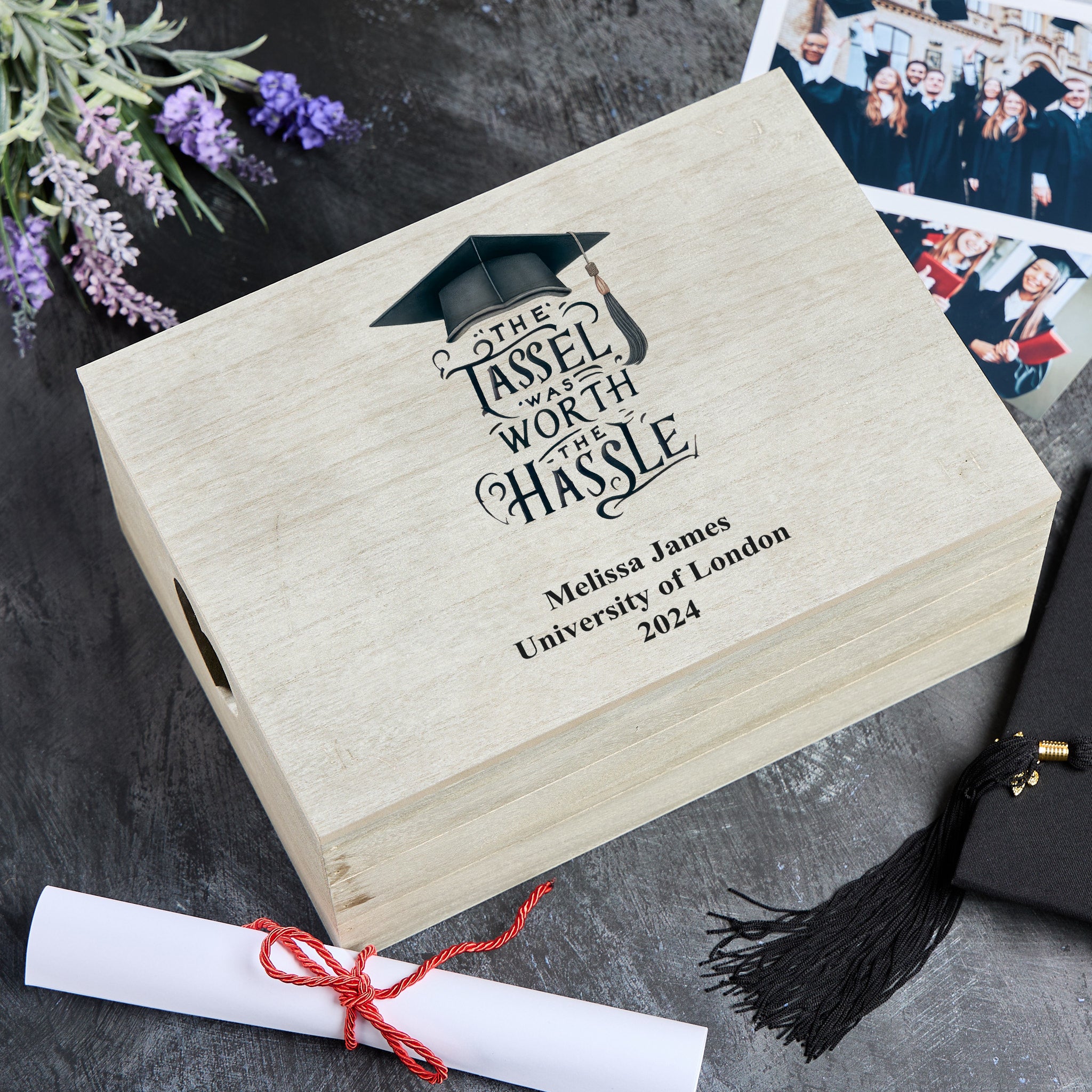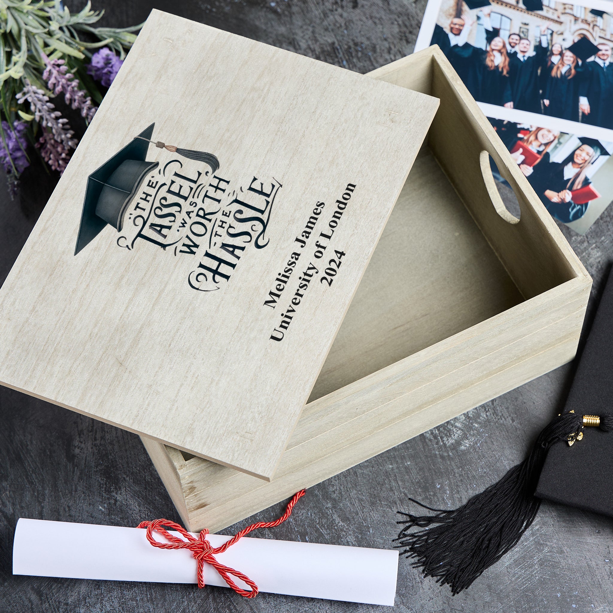 Crafted from premium wood, our Crate Keepsake Box with a graduation design provides an unparalleled way to store precious items. Expertly made, its two parts easily open, allowing for both storage and display. The box measures 35 cm x 25 cm x 15 cm and includes your desired personalisation.