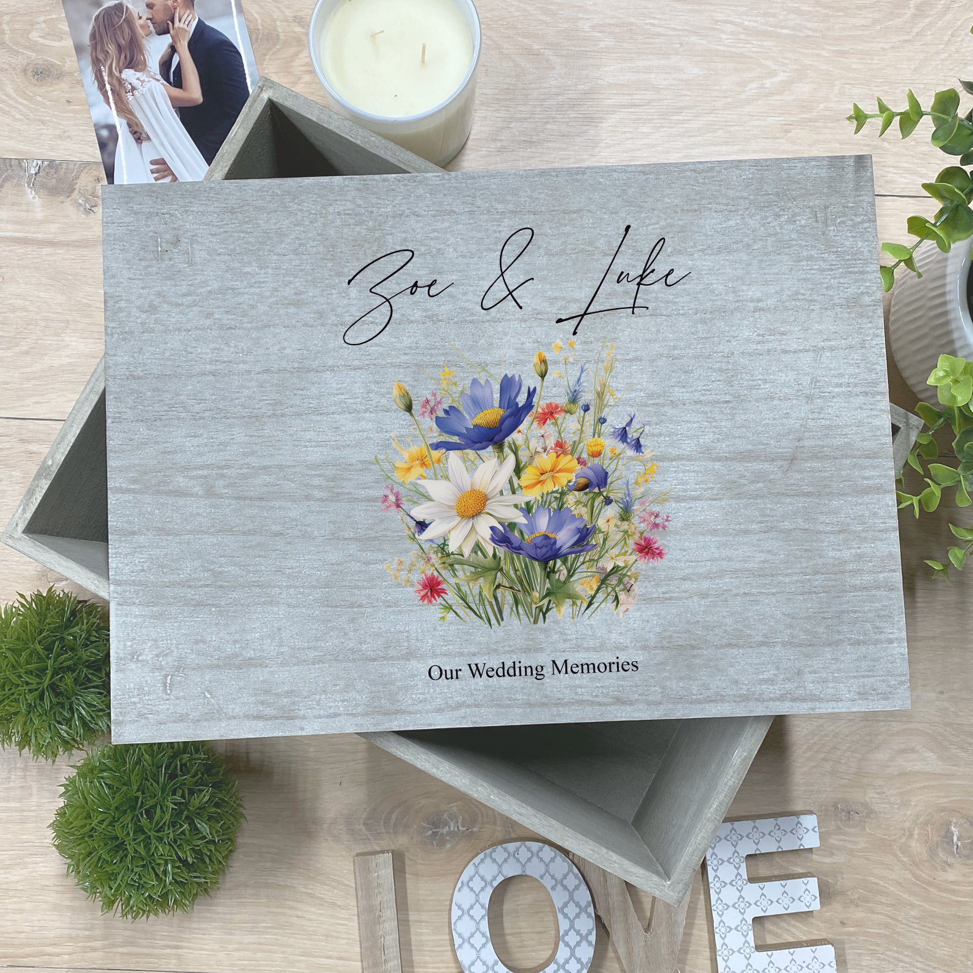 Crafted from premium wood, our Wedding Crate Keepsake Box with a floral design provides an unparalleled way to store precious items. Expertly made, its two parts easily open, allowing for both storage and display. The box measures 35 cm x 25 cm x 15 cm and includes a laser engraving of your desired personalisation.
