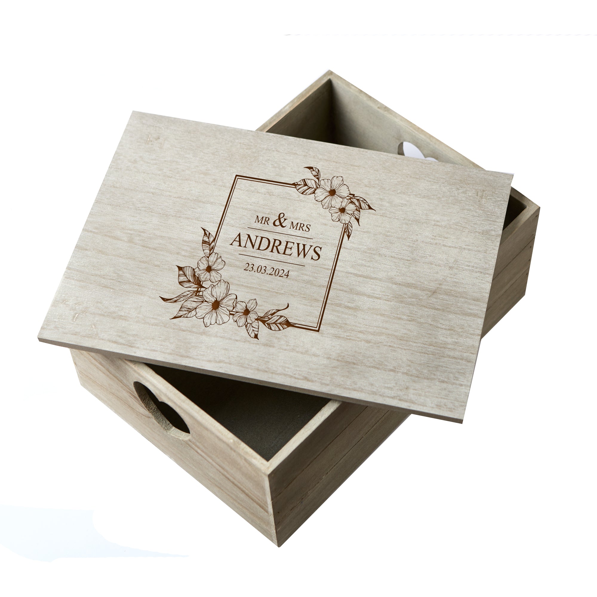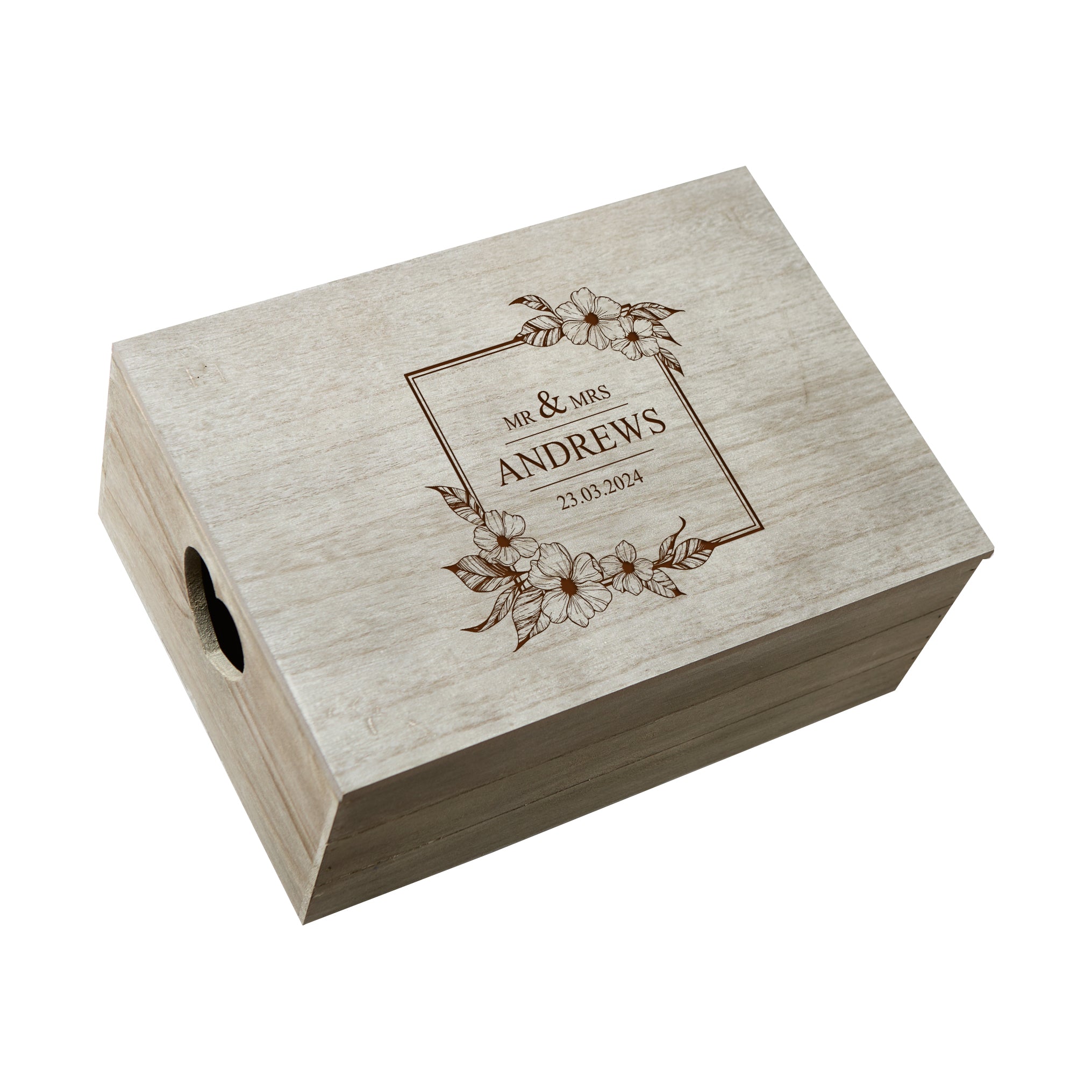 Crafted from premium wood, our Wedding Crate Keepsake Box with a floral design provides an unparalleled way to store precious items. Expertly made, its two parts easily open, allowing for both storage and display. The box measures 35 cm x 25 cm x 15 cm and includes a laser engraving of your desired personalisation. Simply add your message at checkout and enjoy the occasion.