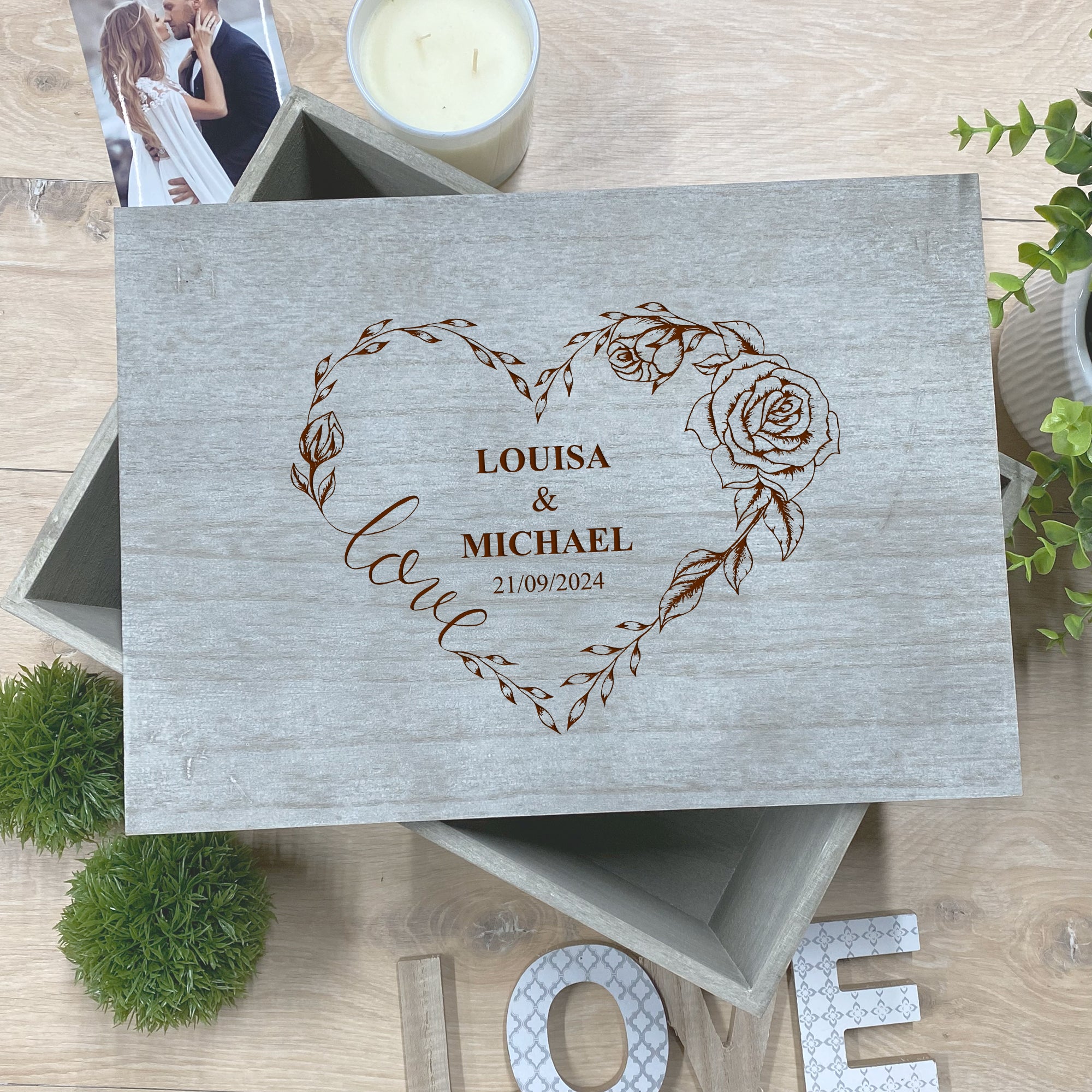 A customised large size Wedding or Anniversary Love Heart Crate Keepsake Container ideal for Gifting to the...