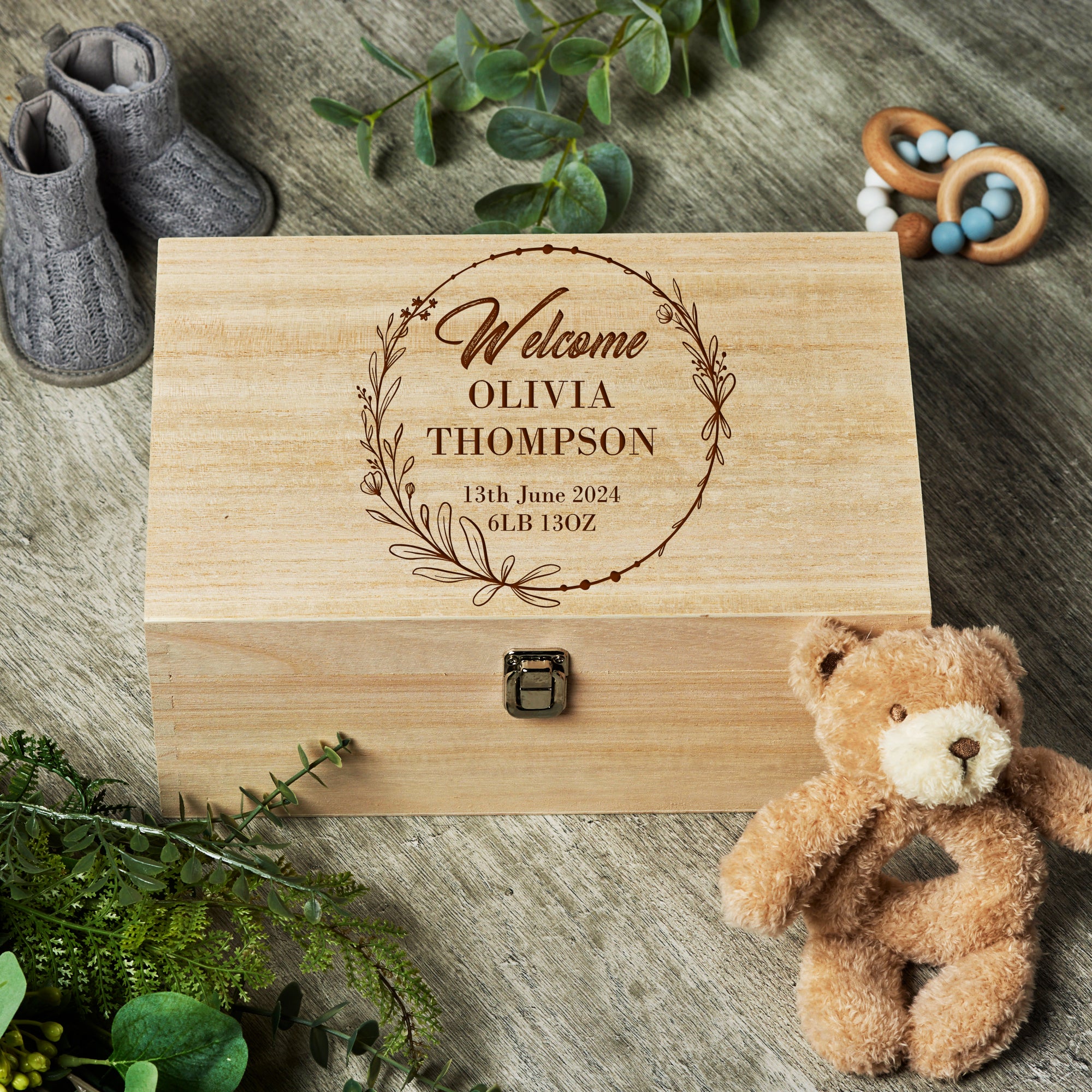 Personalised Baby wooden Memories Keepsake Beautiful Newborn Baby Gift, or a personal keepsake. Made from wood this box is an ideal way to store those important keepsakes. The box is hinged for easy opening and comes with a clip closure.