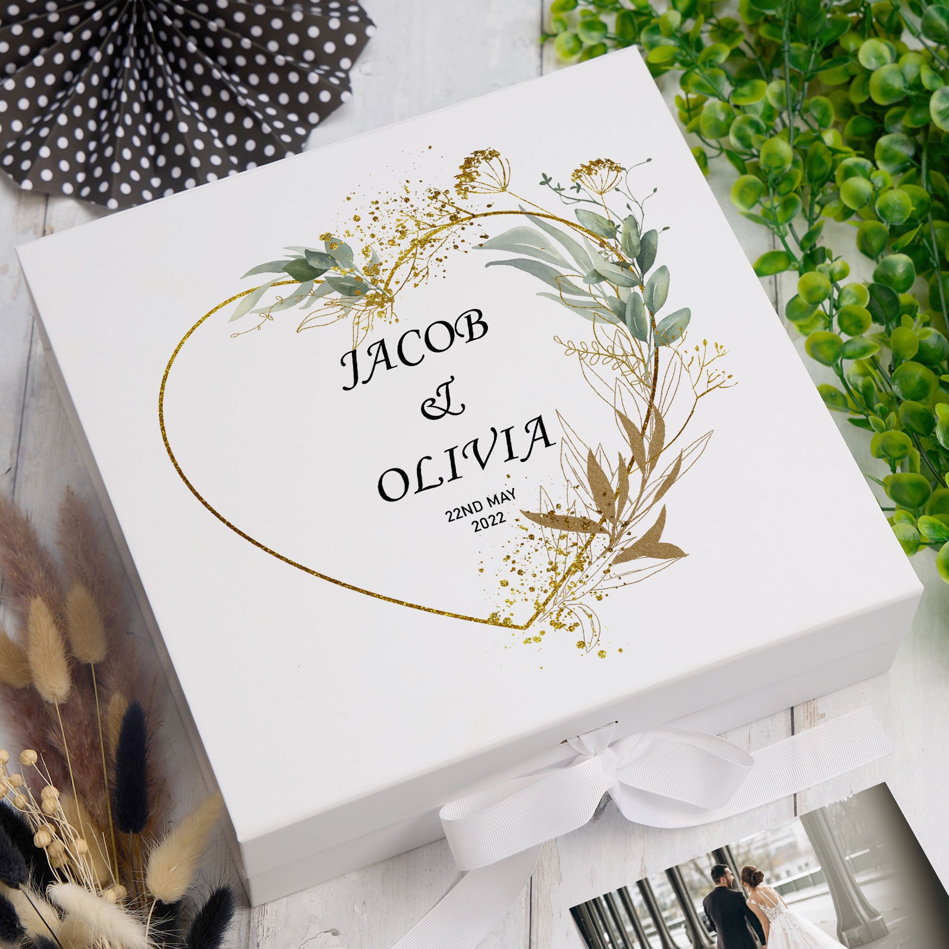 Please state the names of the couple and date This wedding box features a gold green leaf...