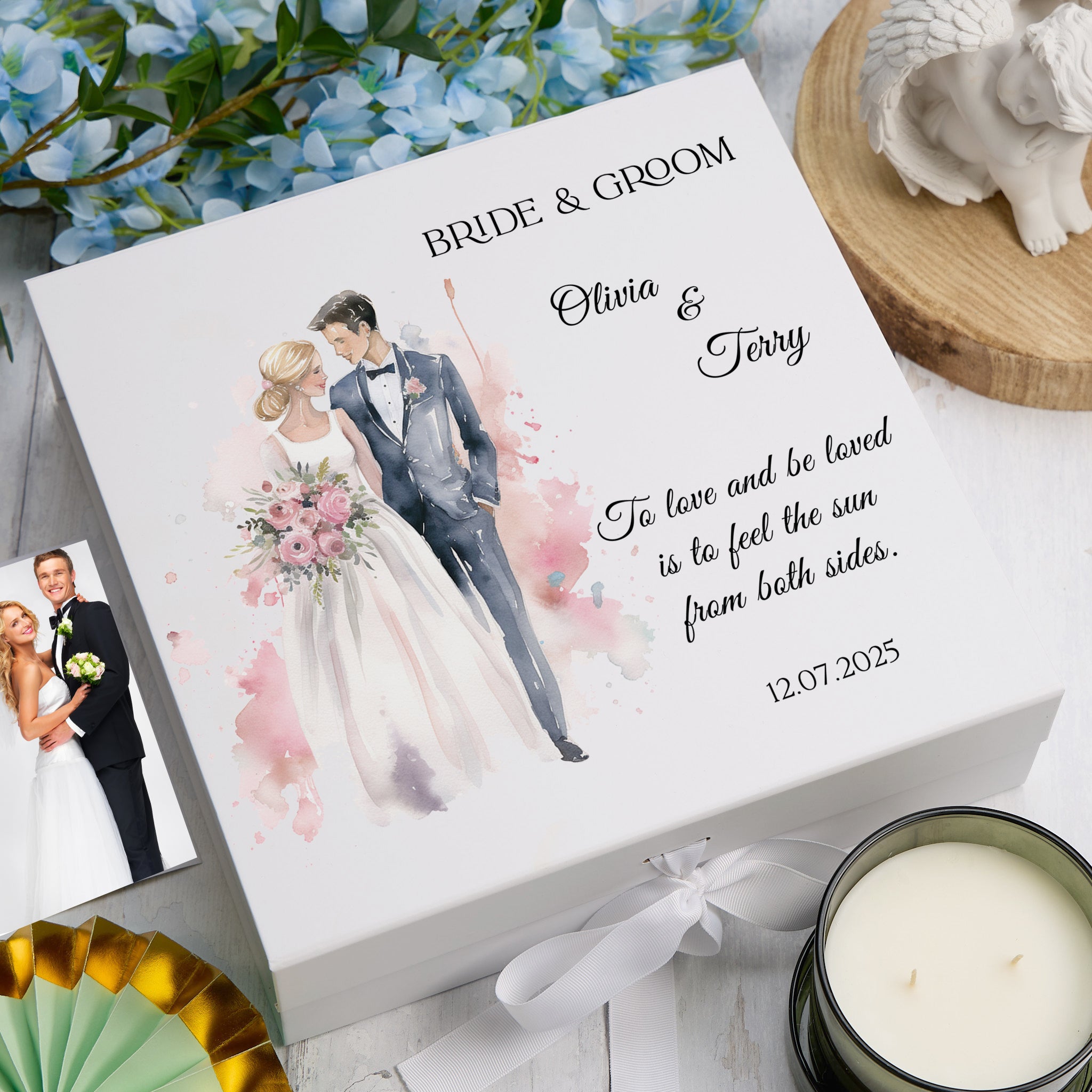 It is a personalised memory storage box that will hold all of their treasured possessions from their special day. This wedding day keepsake box is specialised for personalisation and storage of all your cherished items from your customised wedding day. With a size of 19cm x 17cm x 8cm, it's the perfect versatile option for gifting, storing, or adding to a special wedding hamper. Make your wedding memories truly unforgettable with our personalised keepsake box.