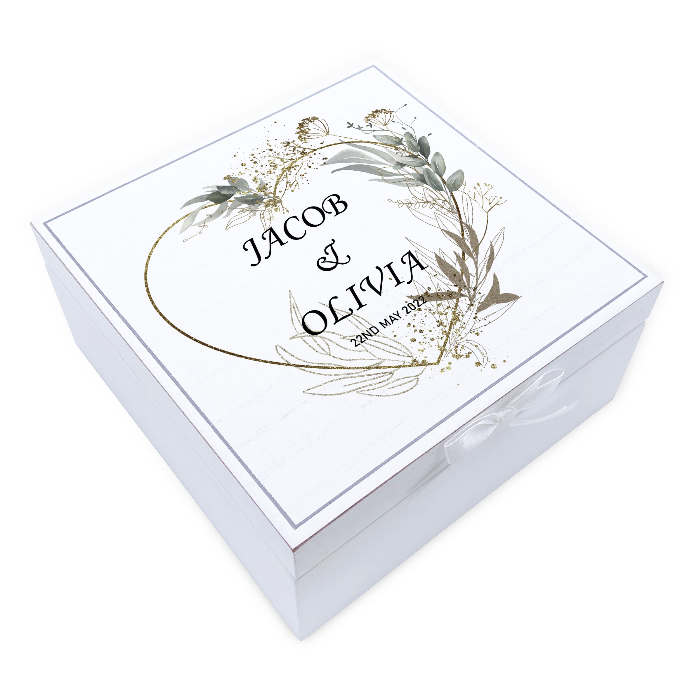 Personalised Wedding Day Vintage Wooden Keepsake Box Gift With Gold & Grey Heart Print